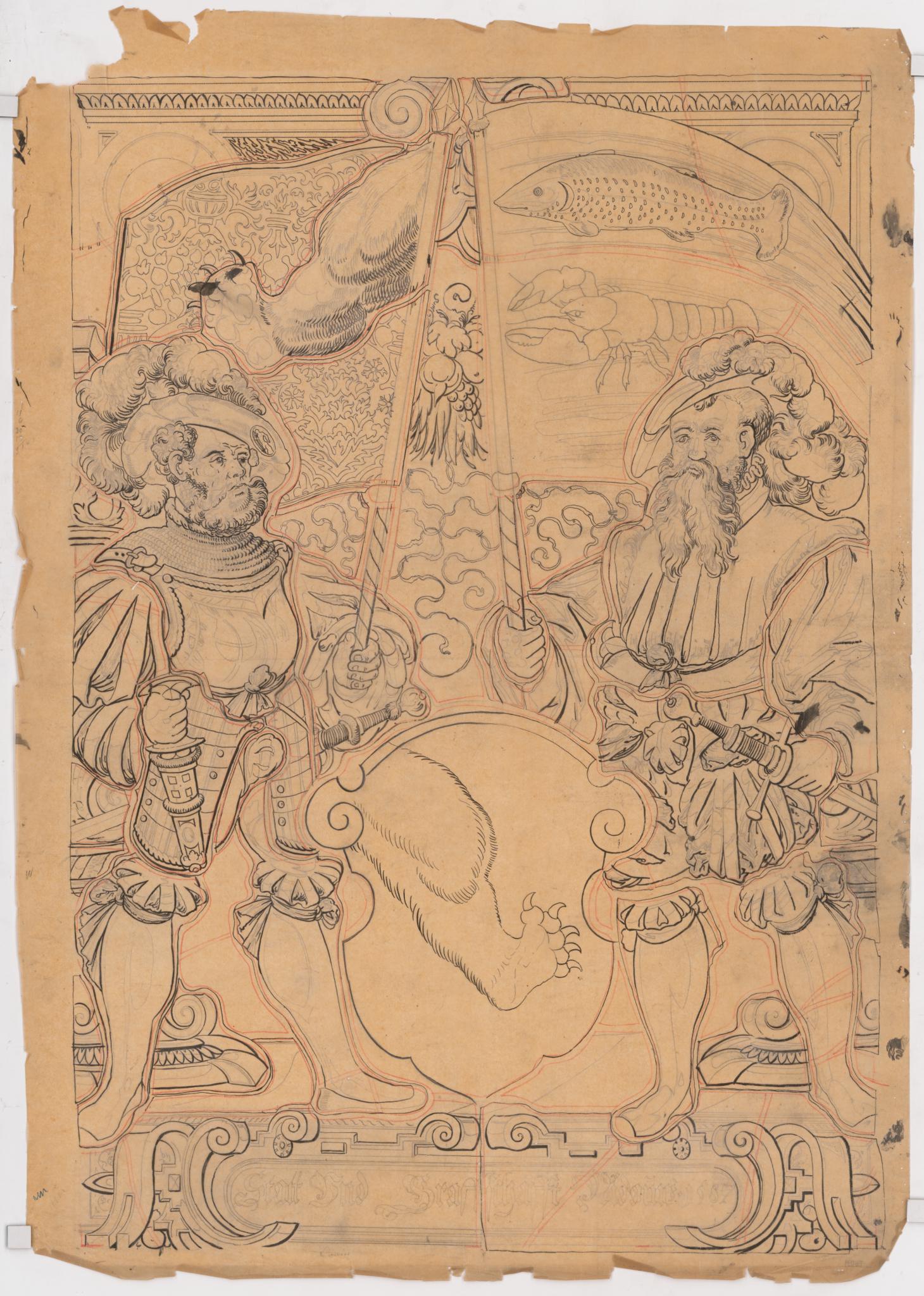 Bleistift, schwarze Tusche und rote Farbe auf Pauspapier.
