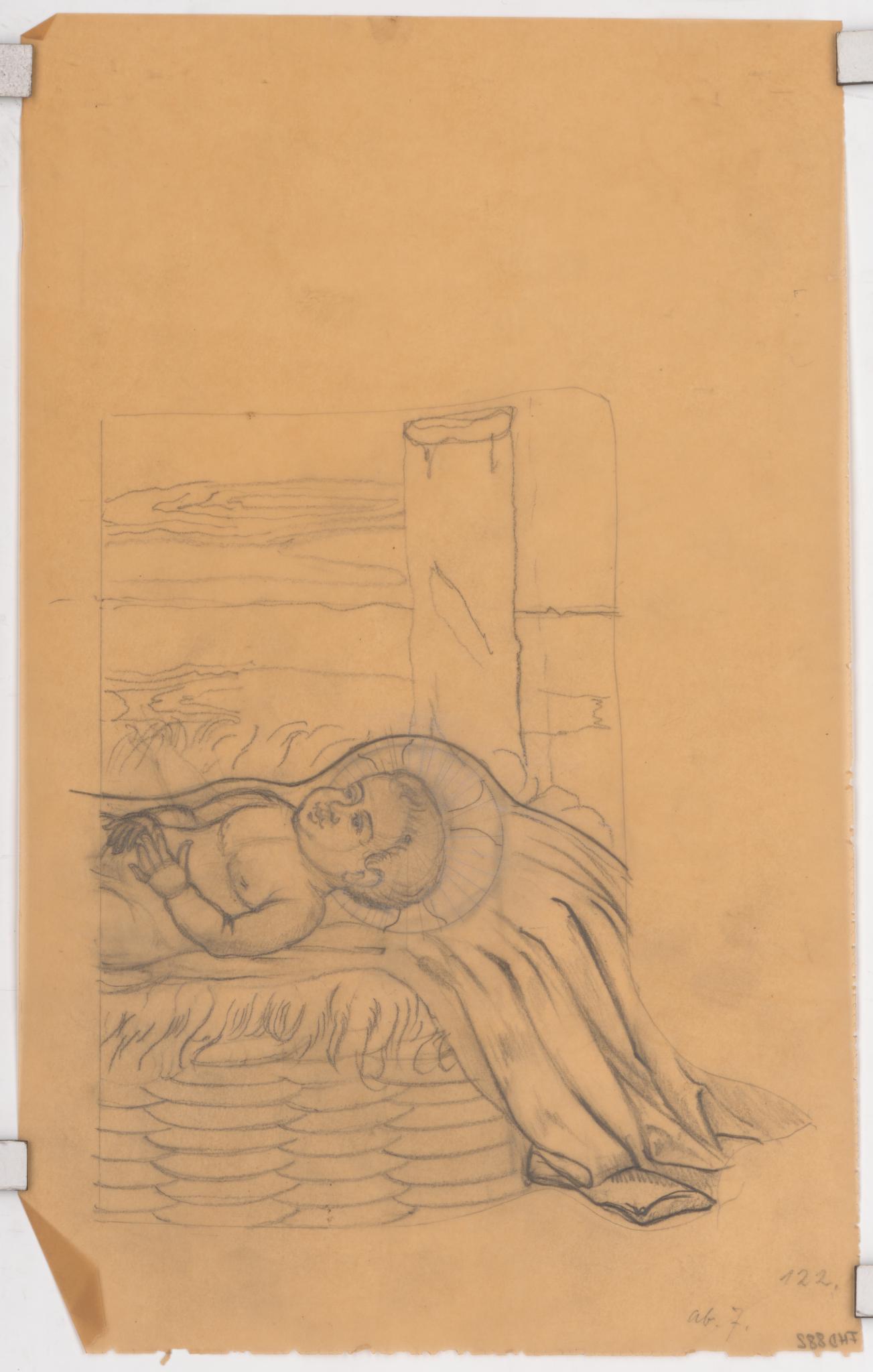 Die Pause zeigt den Oberkörper und die Krippe des Jesuskindes der linken Scheibe des dreiteiligen Glasgemäldes.