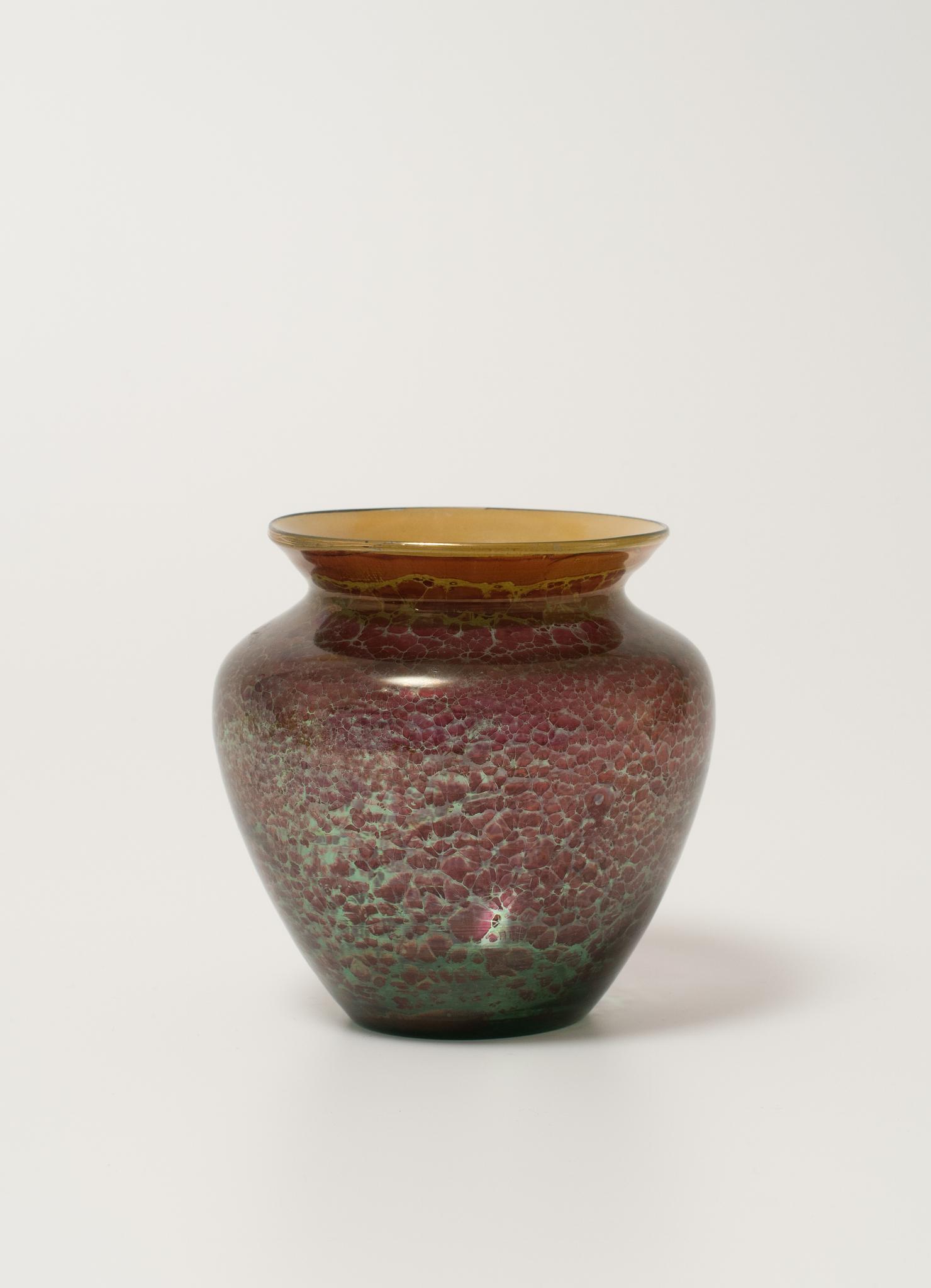 Verre vert, oxydes (sélénium ?) à effet rose inclus à la paraison durant le soufflage par roulement sur le marbre, soufflé en moule, lèvre évasée, surface irisée. Émail appliqué à l’intérieur du vase après refroidissement, puis recuit. Forme: panse tronconique
