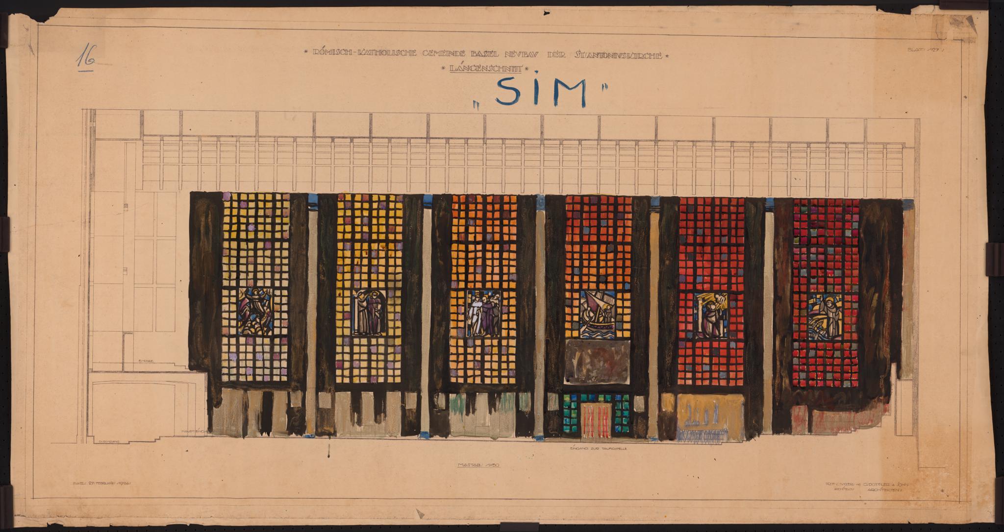 Le chiffre "16" et l'inscription "SIM", qui apparaissent sur tous les projets proposés par Edmond Bille dans le cadre du concours, sont probablement un code permettant l'identification de l'artiste. Le concours a été gagné par Hans Stocker (1896–1983) et Otto Staiger (1894–1967). Les vitraux réalisés entre 1927 et 1930 par les deux artistes bâlois ont eu un retentissement très important dans l'art du vitrail moderne en Suisse (BS_1, BS_2, BS_3, BS_4, BS_5, BS_6, BS_7, BS_8, BS_9, BS_10, BS_11, BS_12).