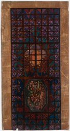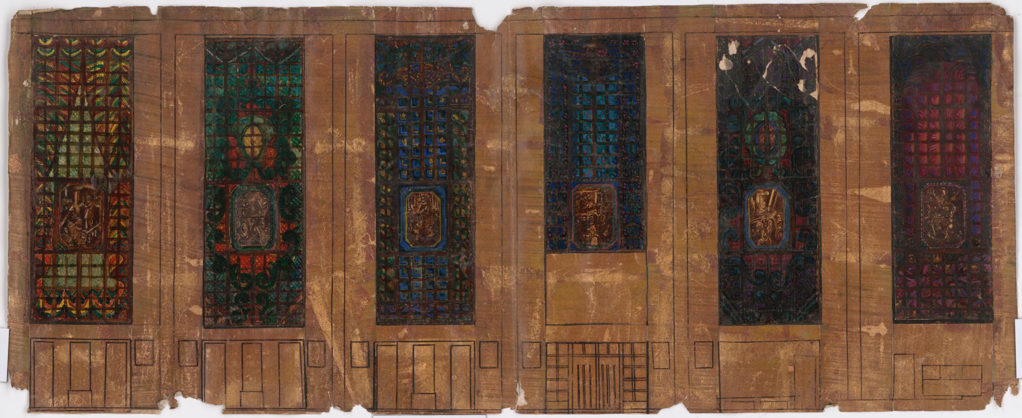 Sur une esquisse de la paroi occidentale de l'église sont représentées six verrières mixtes, dont le fond est composé d'un quadrillage coloré entourant un cartouche central octogonal, parfois surmonté d'ornements et de volutes. Les cartouches centraux comprennent de petites scènes en camaïeu de brun, représentant des épisodes de la vie de saint Antoine, difficilement lisibles.