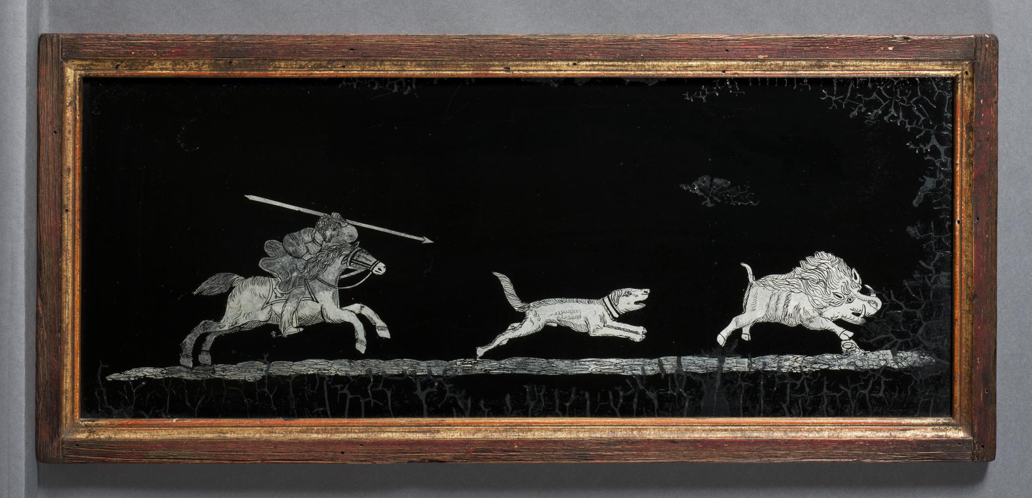 Auf einem schmalen schematischen Bodenstück jagt links ein bärtiger Reiter mit windgebauschtem Mantel auf seinem springenden Pferd einen mächtigen Eber, der beinahe so gross ist wie sein Pferd. Seine Rechte an die Pferdemähne klammernd, holt der Jäger mit seinem Spiess über dem Kopf zum Stoss aus. Vor ihm hetzt sein kräftiger Hund mit Halsband hinter dem Wildschwein her.
