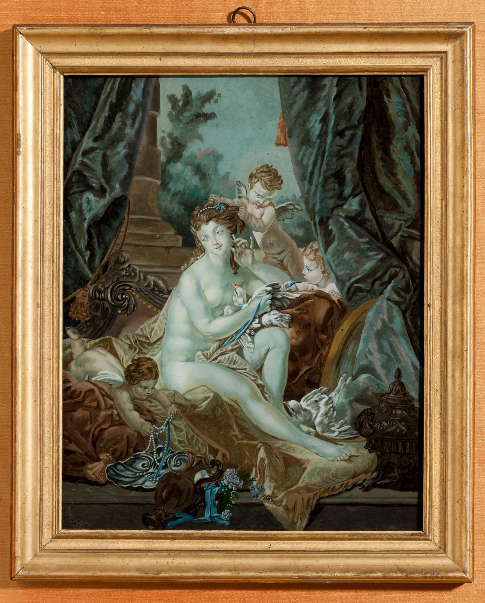 Das in graublaues Licht getauchte Hinterglasgemälde übernimmt seitenverkehrt, doch sehr farbgetreu die Komposition des Farbstiches "La toilette de Vénus", den Jean-François Janinet (1752–1814), der Erfinder der Aquatintatechnik in vier Farben und der autodidaktische Hauptmeister des französischen Farbstiches, 1783 nach dem Gemälde von François Boucher (1703–1770) herausgab. Der Stich, seitengleich zum Gemälde, ist "Madame la Comtesse de Coastin, Née Mailly" gewidmet, doch haben viele Forscher in der Liebesgöttin das Bildnis der Marquise de Pompadour erkennen wollen, denn das Gemälde François Bouchers stammte aus ihrer Sammlung und befand sich 1792 im Château de Choisy. Die sorgfältige und präzise Maltechnik mit der charakteristischen Gestaltung der Bäume, die Augenform, aber auch das ursprüngliche, heute als Futter dienende Schutzpapier weisen das Hinterglasgemälde nach China. Die in Europa hochgeschätzten chinesischen Hinterglasbilder wurden – ebenso wie Porzellan – besonders von jenen Ländern eingeführt, die eine "Ostindische Kompanie" betrieben. Das Hinterglasgemälde mit Venus muss für den französischen Markt bestimmt gewesen sein, wo die Hinterglasmalerei in dieser Form offenbar sonst kaum gepflegt wurde.