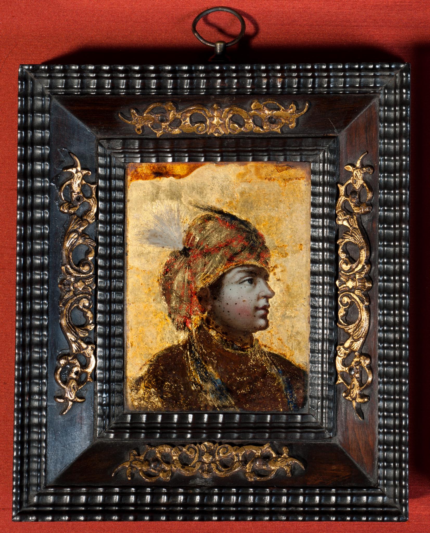 Dieses Hinterglasbild gehört zu einer Serie von sechs Hinterglasbildern, die nach Radierungen von Stefano della Bella (1649–1651) ameliert worden sind. Es handelt sich um eine Folge von zwölf Graphiken unter dem Titel "Mehrere Köpfe nach Art der Perser frisiert". Vielleicht noch teilweise in Paris entstanden, teilweise aber sicher in Florenz, dürften diese weiterhin in Frankreich ediert worden sein. Sie liefern einen Terminus post quem für die Entstehung der Hinterglasbilder, die möglicherweise als Schubladen- oder Türfronten ursprünglich Teile eines Kabinettschrankes waren. Die Vorliebe für Exotisches ist durch Allegorien und idyllische Darstellungen der vier Kontinente in Hinterglasmalereien zeitgenössischer Kabinettschränke gut belegt (Vitrocentre Romont, Slg. R.+F. Ryser RY 3051; Neapel, um 1650).