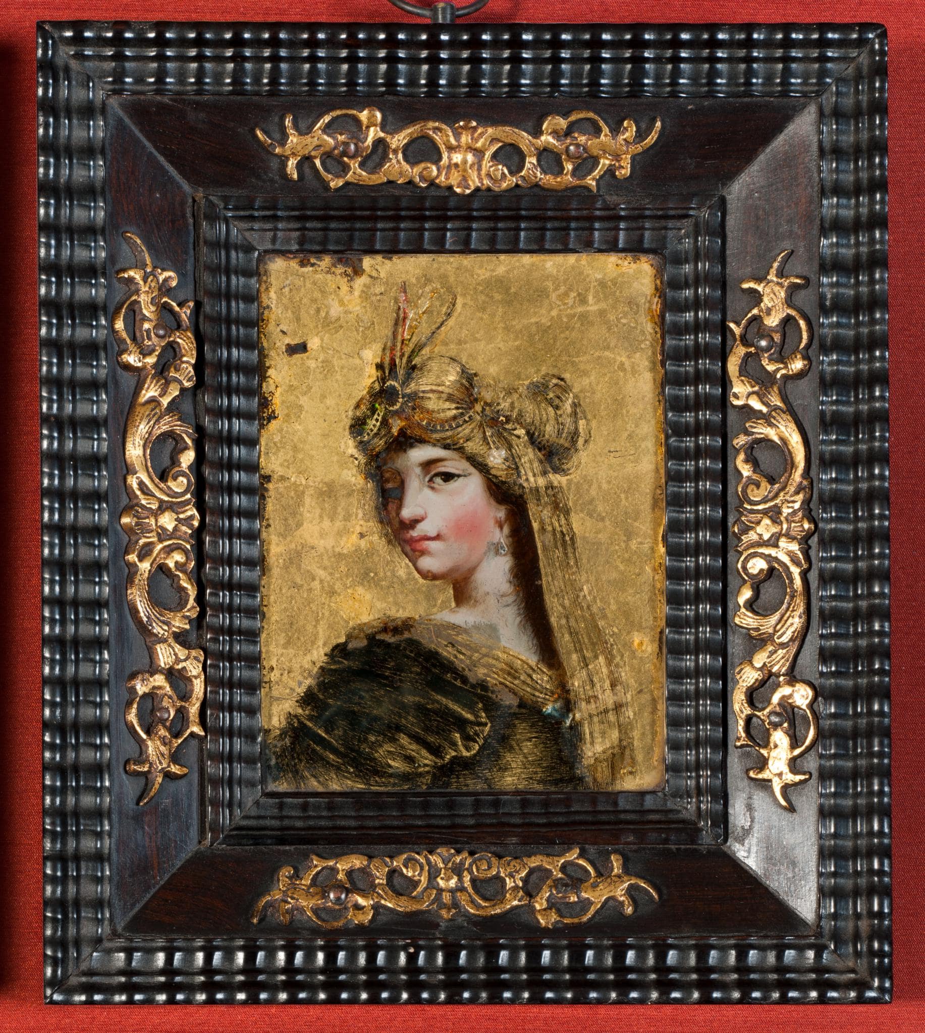 Dieses Hinterglasbild gehört zu einer Serie von sechs Hinterglasbildern, die nach Radierungen von Stefano della Bella (1649–1651) ameliert worden sind. Es handelt sich um eine Folge von zwölf Graphiken unter dem Titel "Mehrere Köpfe nach Art der Perser frisiert". Vielleicht noch teilweise in Paris entstanden, teilweise aber sicher in Florenz, dürften diese weiterhin in Frankreich ediert worden sein. Sie liefern einen Terminus post quem für die Entstehung der Hinterglasbilder, die möglicherweise als Schubladen- oder Türfronten ursprünglich Teile eines Kabinettschrankes waren. Die Vorliebe für Exotisches ist durch Allegorien und idyllische Darstellungen der vier Kontinente in Hinterglasmalereien zeitgenössischer Kabinettschränke gut belegt (Vitrocentre Romont, Slg. R.+F. Ryser RY 3051; Neapel, um 1650).