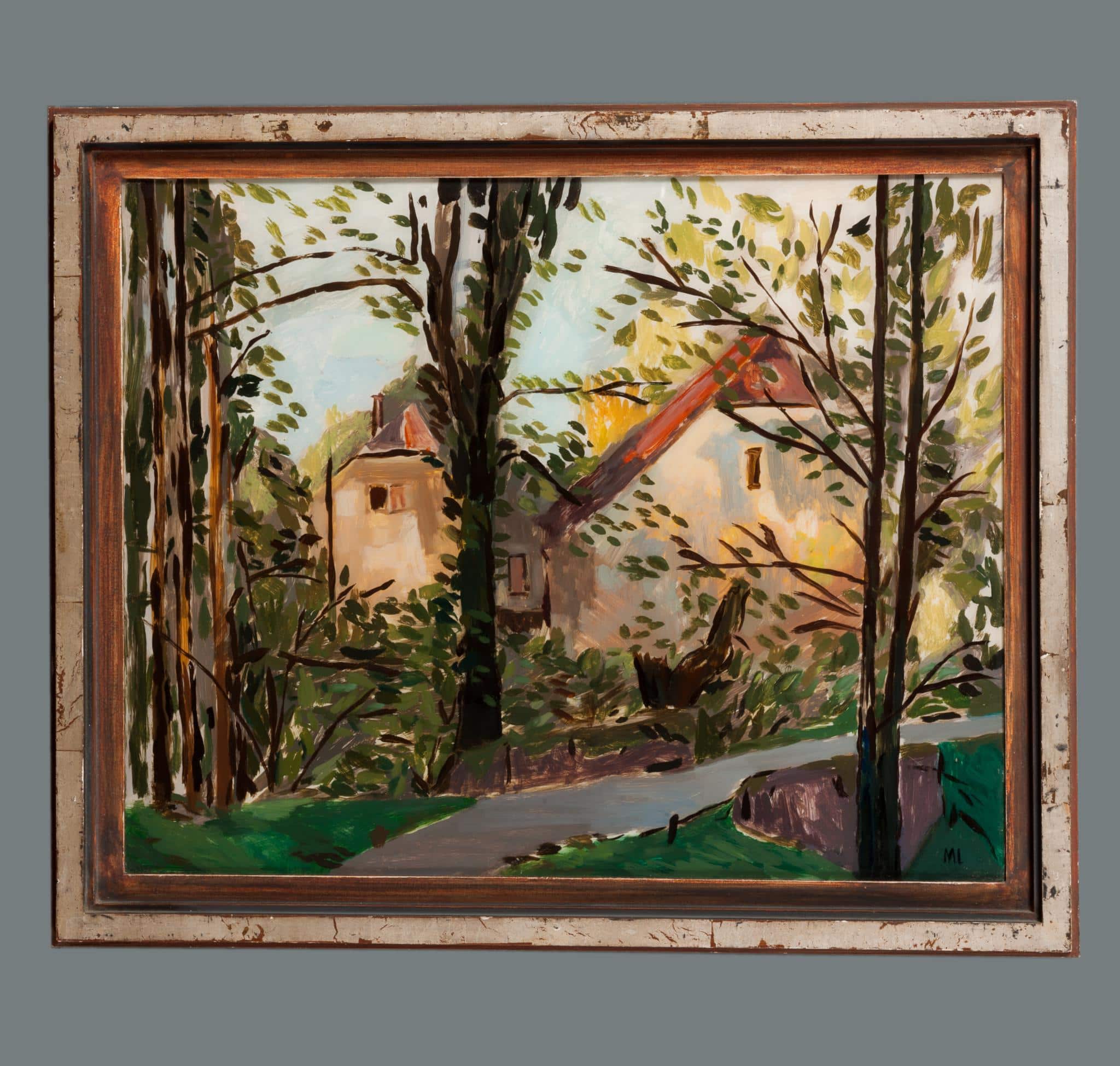 Hinter dem bewaldeten, im Schatten liegenden Vordergrund stehen zwei Häuser mit Krüppelwalmdächern in der Sonne. Sie sind auf einem kleinen grauen, diagonal verlaufenden Weg erreichbar, der auf einer Steinbrücke über einen Bach führt, welcher die Mühle betrieb.