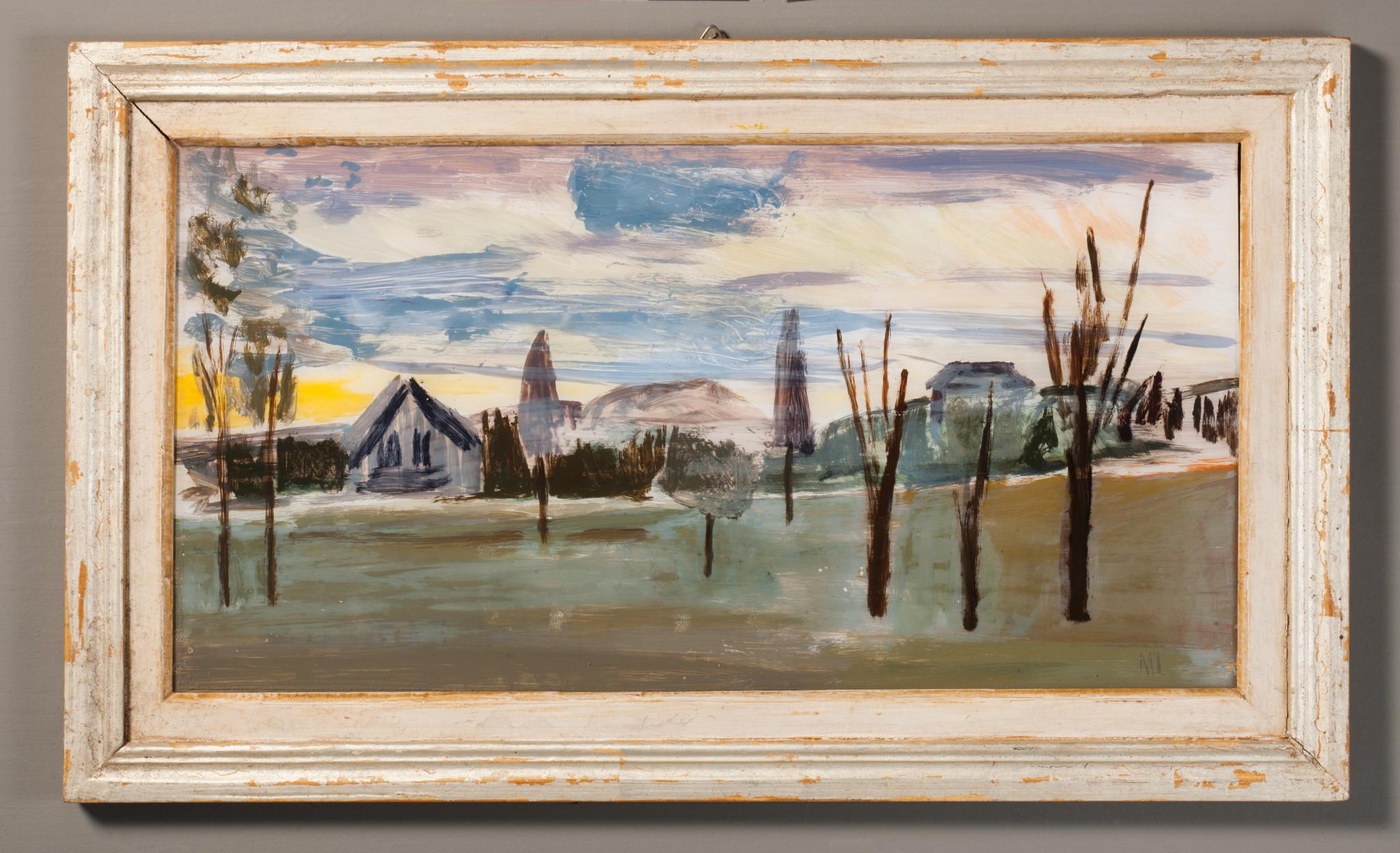 Unter den gelb, rosa und blau gefärbten Schleierwolken eines Abendhimmels zieht der Blick über eine grüne Wiese durch wenige, schematisch gemalte und kaum belaubte Bäume auf einige Häuser am Ortsrand Arlesheims.