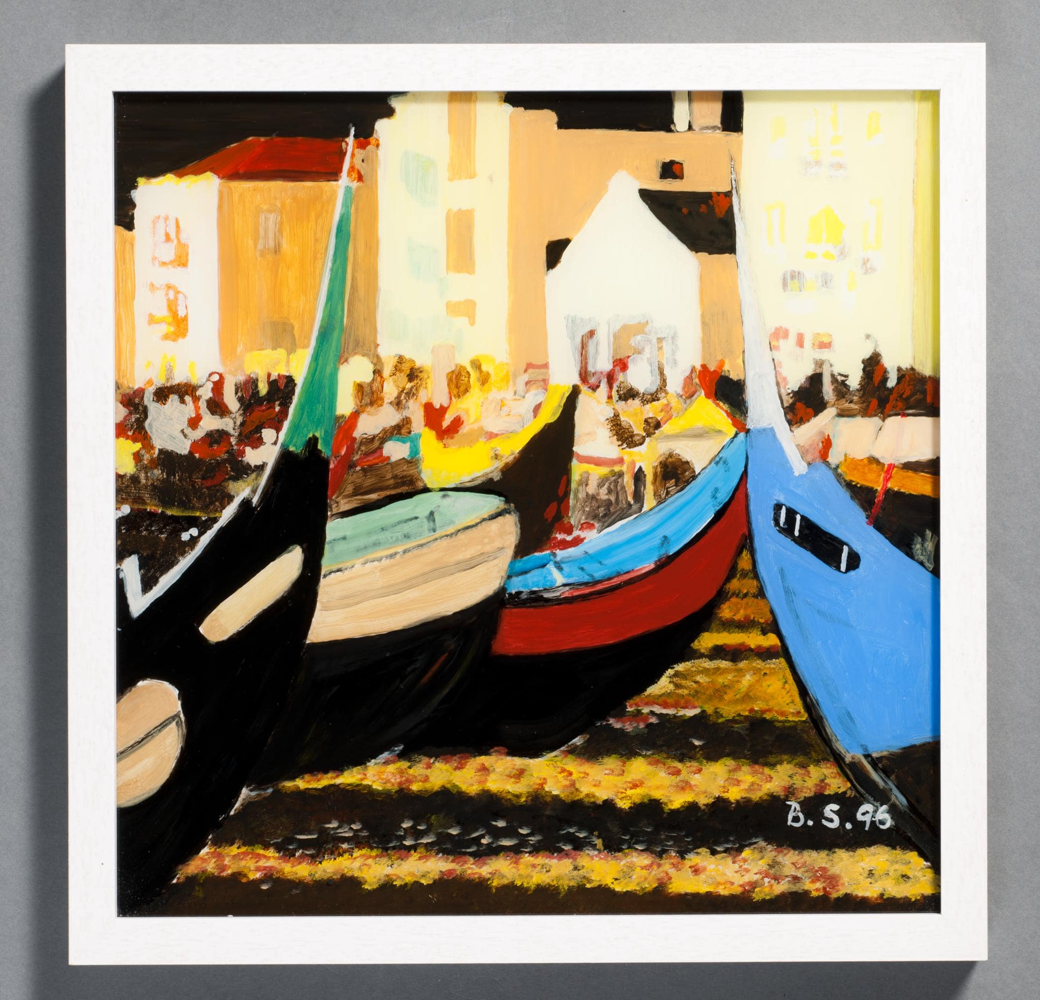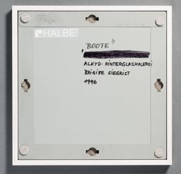 Der Rückseitenschutz ist mit Bleistift und mit schwarzem Filzstift beschriftet: Fuge / "BOOTE" / ALKYD – HINTERGLASMALEREI / BRIGITTE SIEGRIST / 1996.