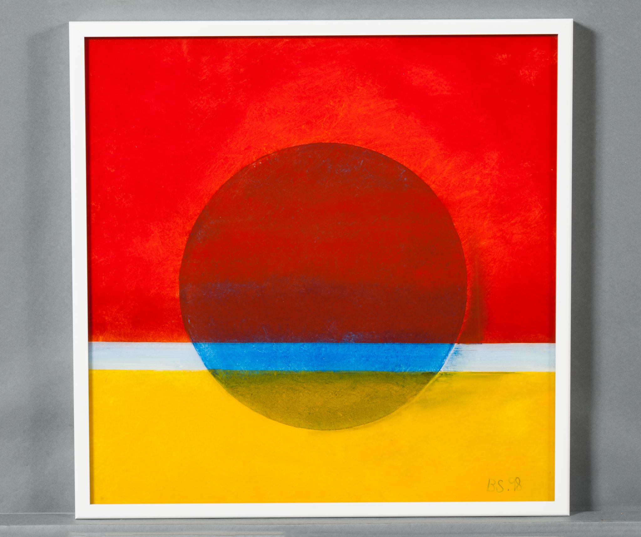 Das Hinterglasgemälde besteht aus einem rot-blau-grünen Kreis, der von einem roten und gelben Grund überlappt wird, sowie aus einem blau-weissen horizontalen Streifen, der die Darstellung im Verhältnis des goldenen Schnittes in zwei ungleiche Hälften teilt.
