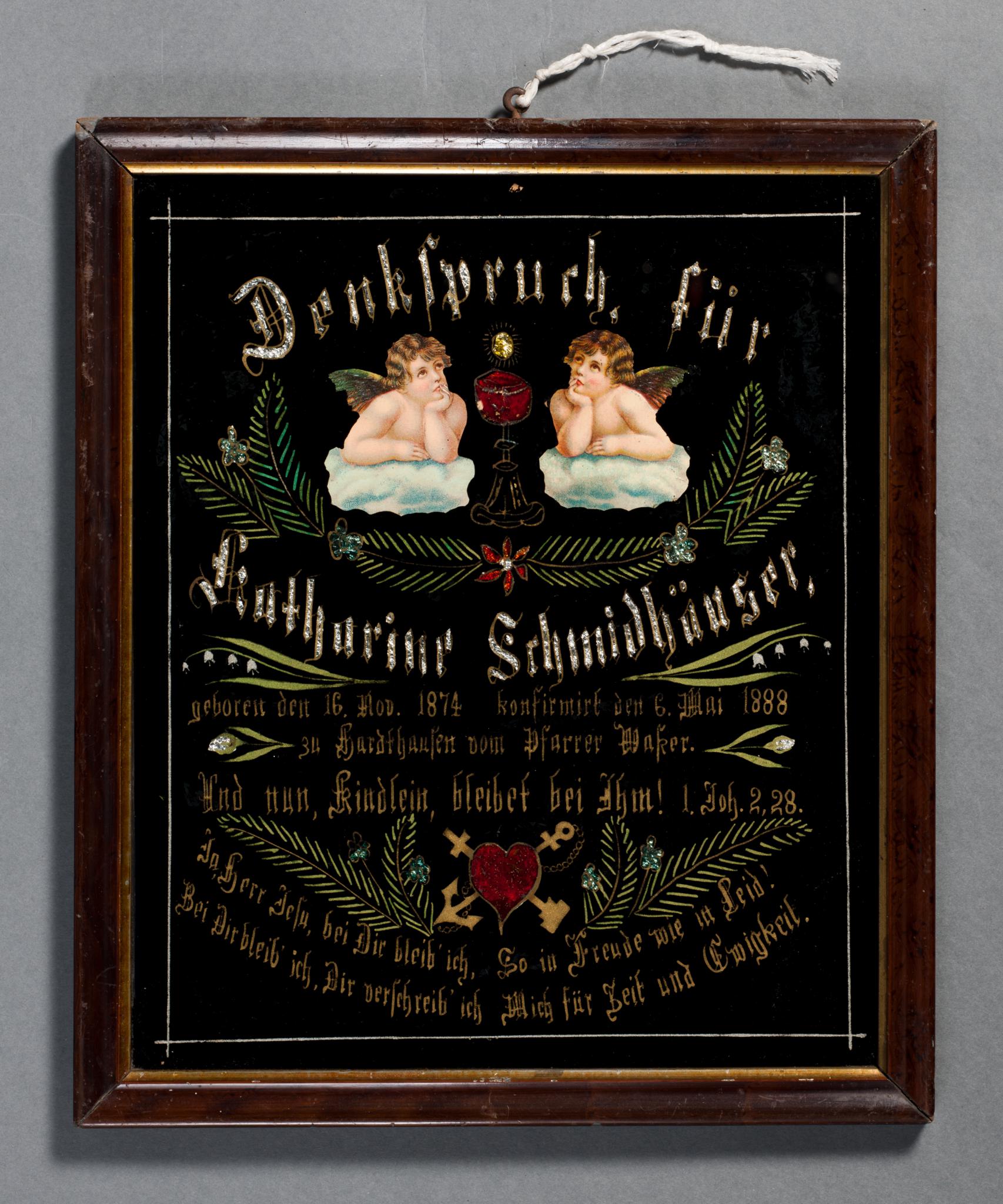 Denkspruch. für / Katharine Schmidhäuser, / geboren den 16. Nov. 1874 konfirmirt den 6. Mai 1888 / zu Hardthausen vom Pfarrer Waker. / Und nun, Kindlein, bleibet bei Ihm! 1. Joh. 2,28. / Ja, Herr Jesu, bei Dir bleib ich, So in Freude wie in Leid! / Bei Dir bleib' ich, Dir verschreib' ich Mich für Zeit und Ewigkeit.