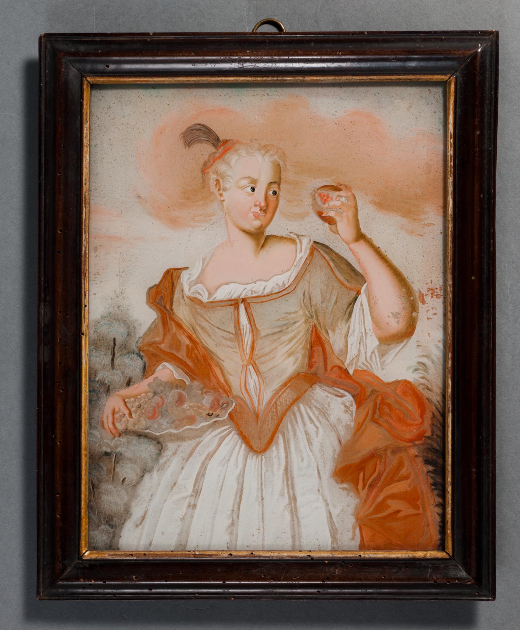 Eine Frau mit einem kleinen Federhut hält als Allegorie des Herbstes in der rechten Hand eine Obstschale und in der linken einen Granatapfel, auf den sie ihren Blick richtet. Sie trägt über einem weissen Kleid mit breitem Ausschnitt ein bräunlich-blaues Mieder und einen um ihre Hüfte drapierten roten Mantel. Unter dem im Abendrot gefärbten Wolkenhimmel sind im Hintergrund neben der Figur links Bäume, rechts ein Strauch erkennbar. Die Bildwirkung dieser Hinterglasmalerei ist durch die starke Verblassung der Farben erheblich verfälscht.