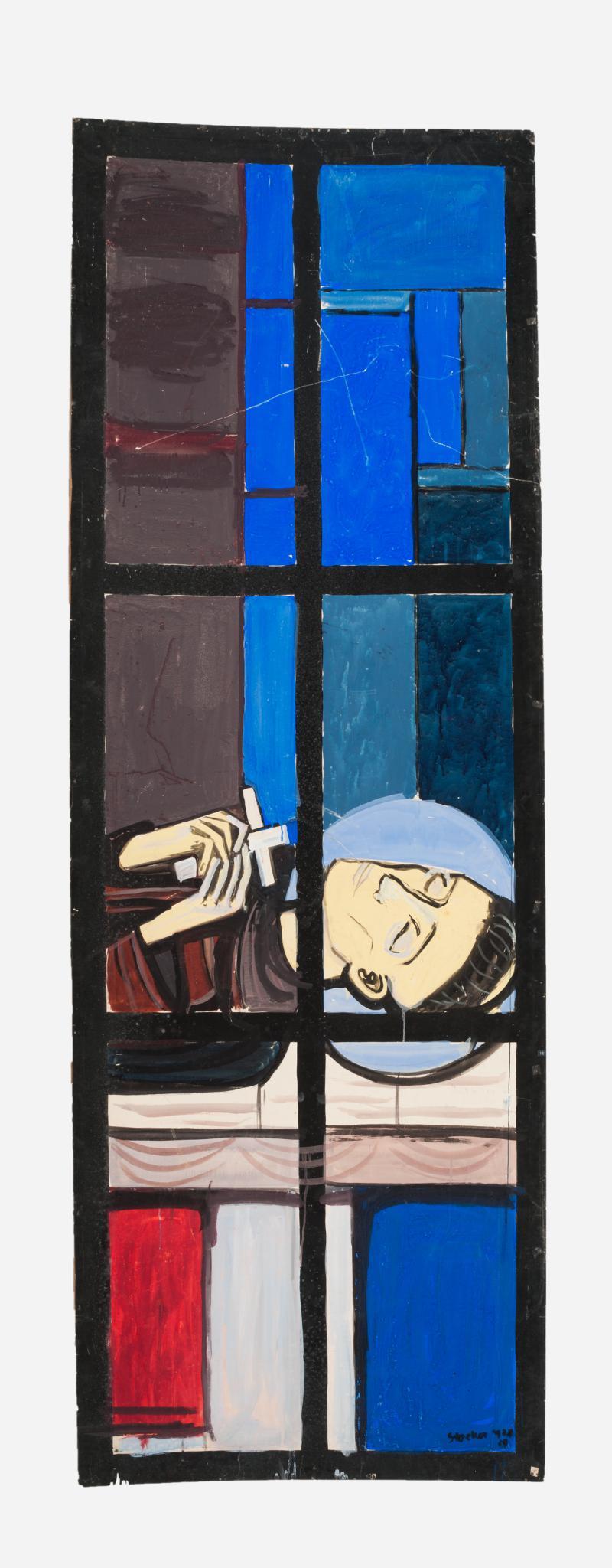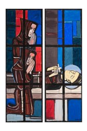 Ce carton représente la partie droite d’une scène montrant la mort de saint Antoine. La partie gauche, avec deux moines agenouillés, est illustrée sur le carton VMR_1323. La scène occupe un huitième de la surface totale du vitrail réalisé en 1929 pour l’Antoniuskirche à Bâle et situé sur la paroi occidentale de l’église, cinquième fenêtre depuis l’entrée (BS_5). Le carton a été marouflé sur pavatex en 1982.