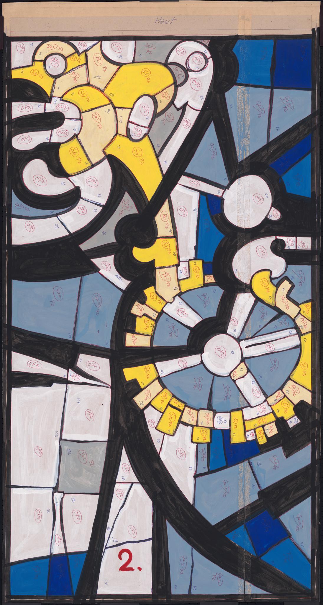 Carton du deuxième panneau du registre supérieur pour une dalle de verre évoquant de manière stylisée le mouvement d’une montre mécanique, avec diverses pièces de mécanique horlogère. Nombreuses annotations (chiffres et lettres), dont le chiffre 2 en rouge (numéro du panneau).