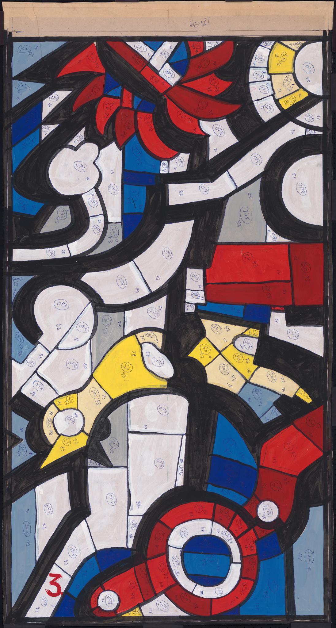 Ce carton correspond au troisième panneau du registre supérieur (N° 3) de la grande dalle de verre réalisée en 1967 à Granges (SO) pour la villa d’Alfred Fischer, alors directeur de la manufacture de montres Baumgartner Frères SA à Granges. La dalle est constituée de quinze panneaux, que l’artiste a numérotés de 1 à 15, de gauche à droite et de haut en bas. La maquette PT_1 en présente la totalité. Le chiffre rouge 3 indique le numéro de panneau, alors que les autres inscriptions (chiffres et lettres) se rapportent d’une part à la numérotation des pièces de verre (de 1 à 136), d’autre part aux références des couleurs choisies.