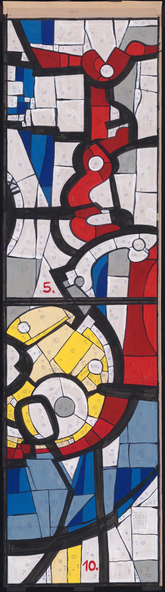 Carton des cinquièmes panneaux des registres supérieur et médian pour une dalle de verre évoquant de manière stylisée le mouvement d’une montre mécanique, avec diverses pièces de mécanique horlogère. Nombreuses annotations (chiffres et lettres), dont les chiffres 5 et 10 en rouge (numéros des panneaux). En bas à droite, liste des couleurs et leur code correspondant.