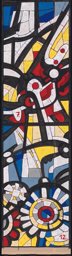 Carton des quatrièmes panneaux des registres médian et inférieur pour une dalle de verre évoquant de manière stylisée le mouvement d’une montre mécanique, avec diverses pièces de mécanique horlogère. Nombreuses annotations (chiffres et lettres), dont les chiffres 9 et 14 en rouge (numéros des panneaux).