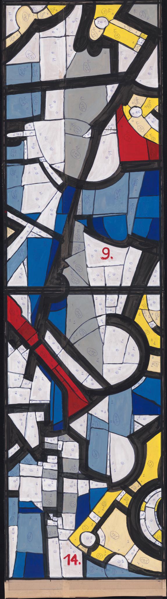 Ce carton correspond aux quatrièmes panneaux des registres médian et inférieur (N° 9 et 14) de la grande dalle de verre réalisée en 1967 à Granges (SO) pour la villa d’Alfred Fischer, alors directeur de la manufacture de montres Baumgartner Frères SA à Granges. La dalle est constituée de quinze panneaux, que l’artiste a numérotés de 1 à 15, de gauche à droite et de haut en bas. La maquette PT_1 en présente la totalité. Les chiffres 9 et 14 en rouge indiquent le numéro de panneau, alors que les autres inscriptions (chiffres et lettres) se rapportent d’une part à la numérotation des pièces de verre (de 1 à 95 pour le panneau 9, de 1 à 133 pour le panneau 14), d’autre part aux références des couleurs choisies.