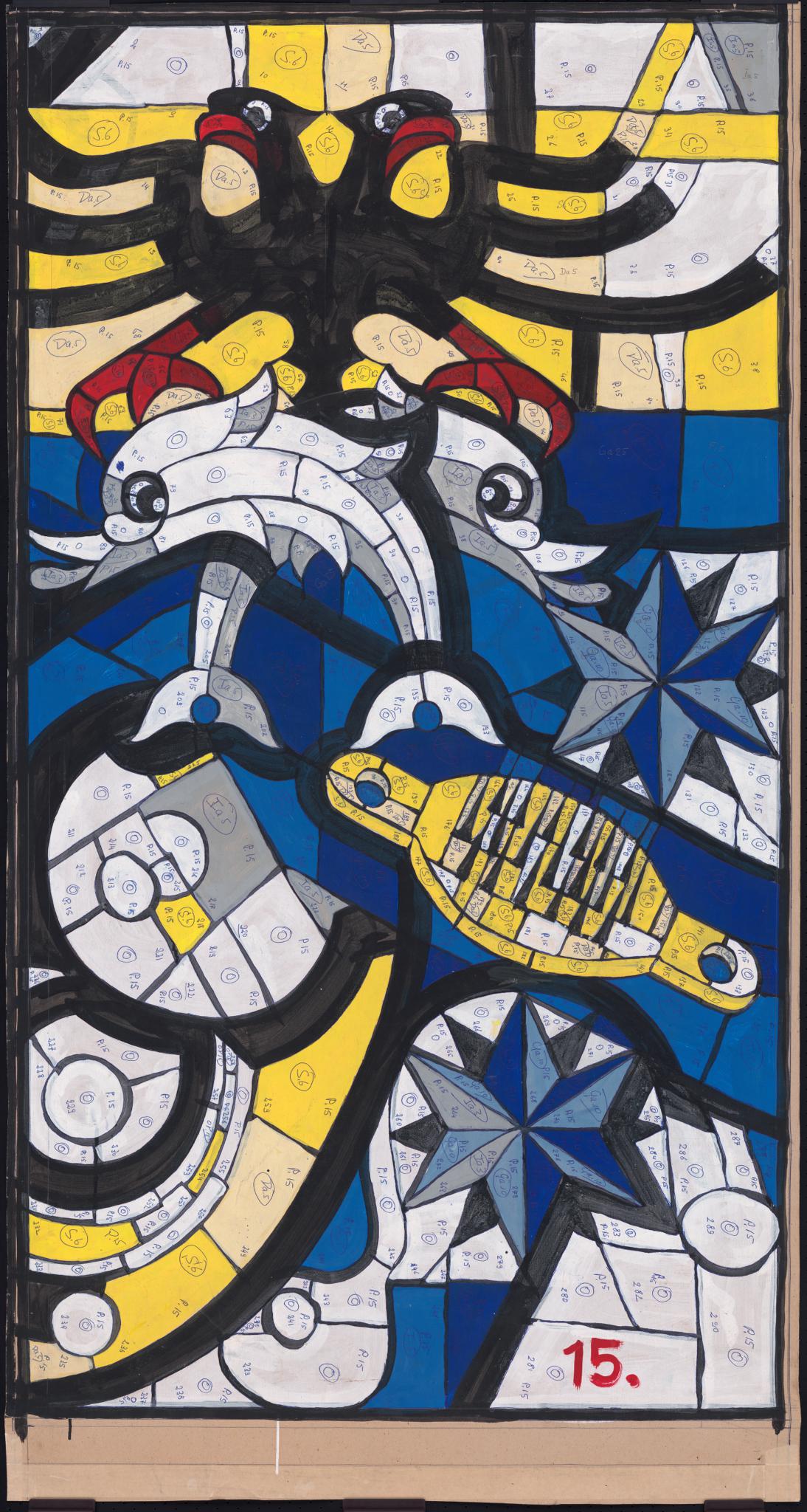 Carton du cinquième panneau du registre inférieur pour une dalle de verre représentant de manière stylisée les armoiries Fischer (deux poissons d’argent entrecroisés sur fond azur, surmontés d’une aigle bicéphale de sable aux ailes déployées) et d’autres armoiries, sans doute Hediger (deux étoiles d’azur entourant un objet d’or non identifié sur fond azur). Les éléments héraldiques sont entremêlés à diverses pièces de mécanique horlogère. Nombreuses annotations (chiffres et lettres), dont le chiffre 15 en rouge (numéros des panneaux).