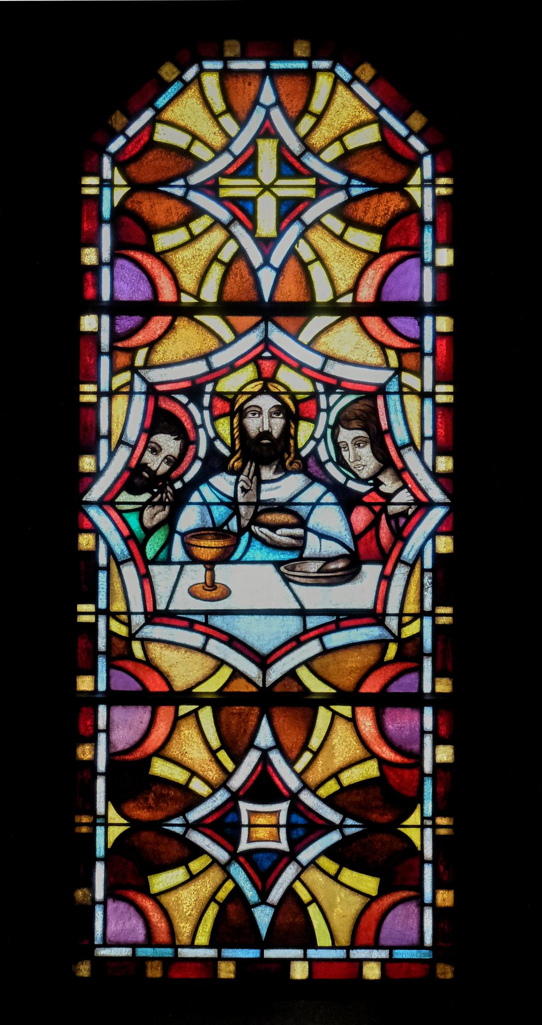 Vitrail composé de trois panneaux. Au centre d’un encadrement ornemental coloré, dans un médaillon octogonal : le Christ en buste tient du pain de sa main gauche et le bénit de l’autre. Il est entouré de deux apôtres. Devant eux se trouvent une table avec une coupe ainsi qu’une assiette contenant une seconde miche de pain.