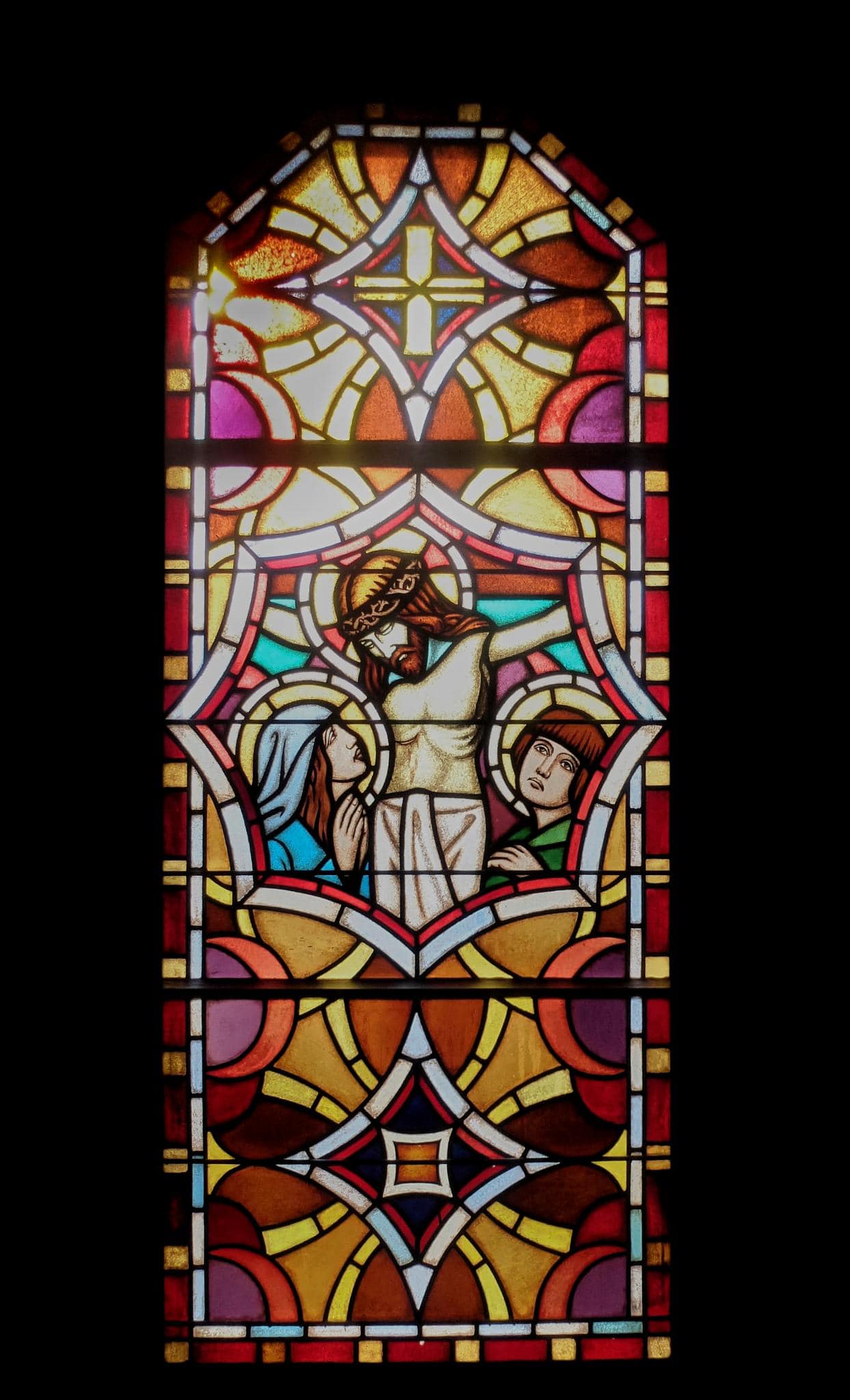 Vitrail composé de trois panneaux. Au centre d’un encadrement ornemental coloré, dans un médaillon octogonal : au centre, le Christ crucifié a sa tête penchée vers la Vierge qui le regarde. Elle se tient devant lui les mains jointes. A droite Jean, sa main gauche posée sur sa poitrine, regarde dans le vague.