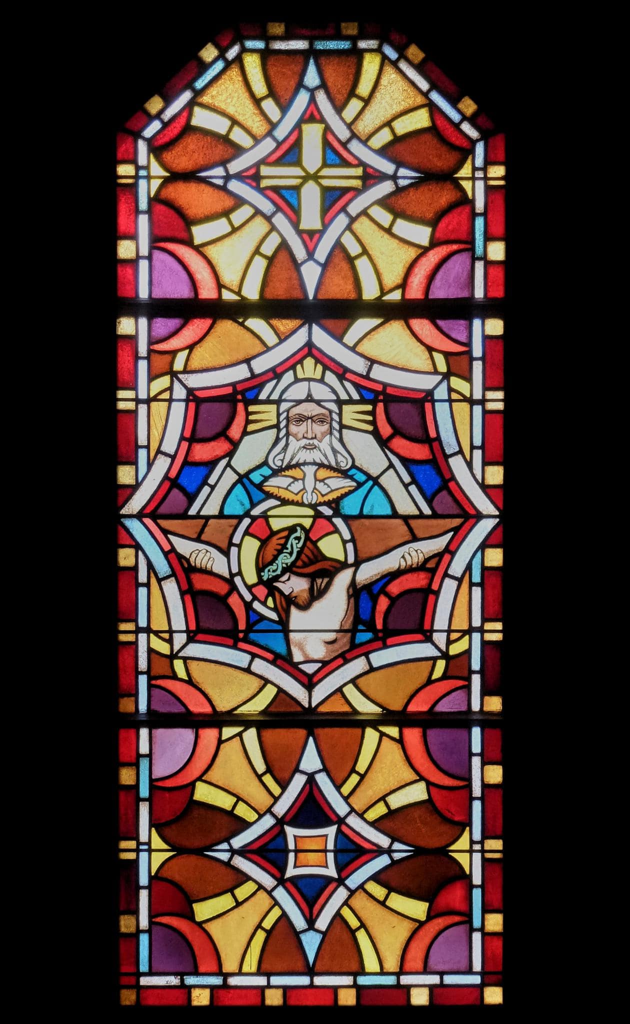 Vitrail composé de trois panneaux. Au centre d’un encadrement ornemental coloré, dans un médaillon octogonal : Dieu le Père présenté de face soutient le Christ en croix. Entre eux se trouve la colombe du Saint-Esprit.