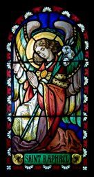 L’archange Gabriel, agenouillé et les mains jointes, tient un lys contre son bras gauche. Il baisse sa tête et ses yeux sont clos. Il porte un grand manteau orange sur une robe beige ornée de motifs ronds et d’une large bordure.