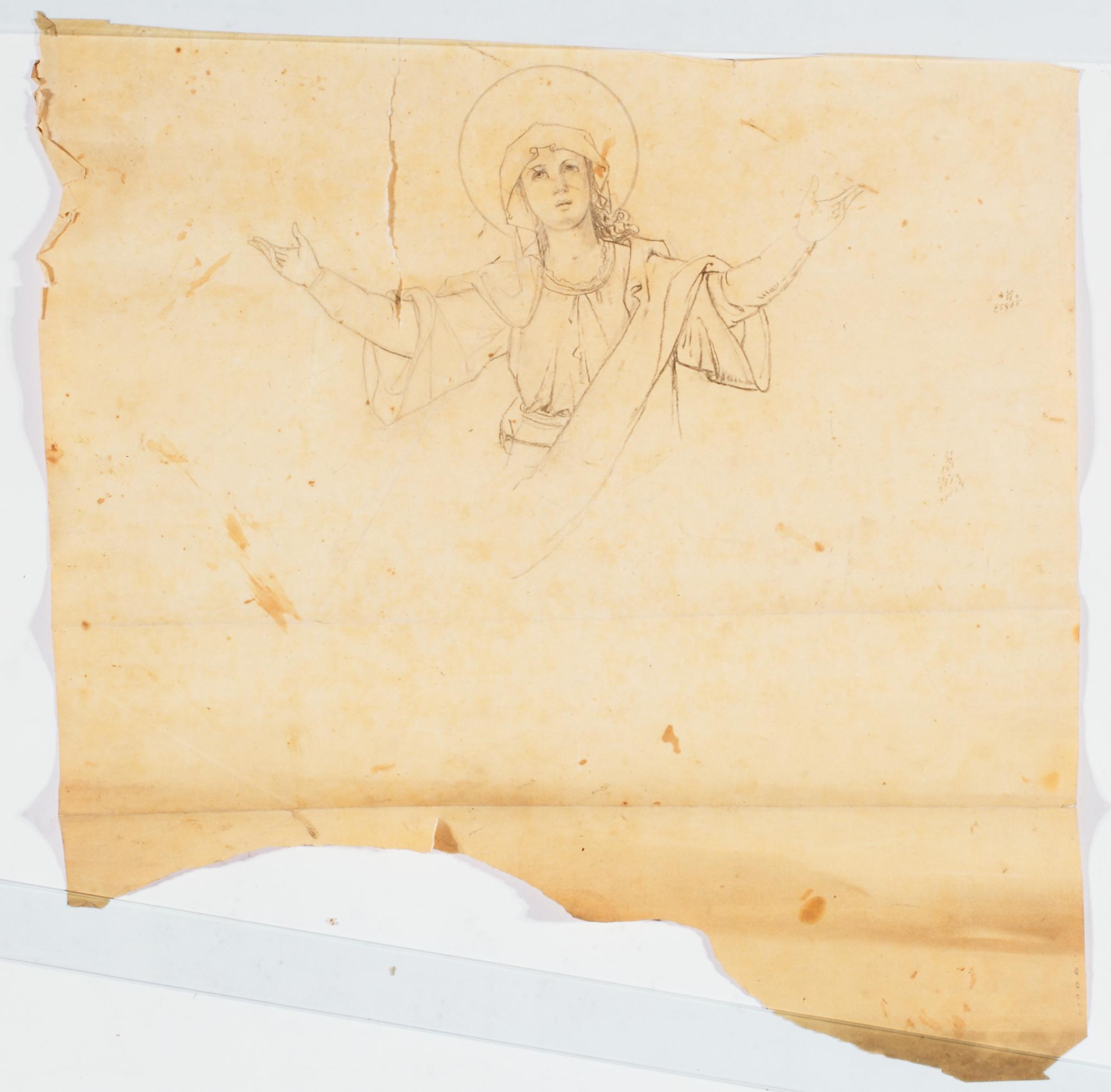 Cette esquisse est un travail préparatoire pour un vitrail avec un médaillon représentant l’Assomption de la Vierge dans sa partie supérieure (VMR_803). Il existe un second projet plus complet où la Vierge est représentée en entier avec quelques éléments composant la fenêtre (KF_366).