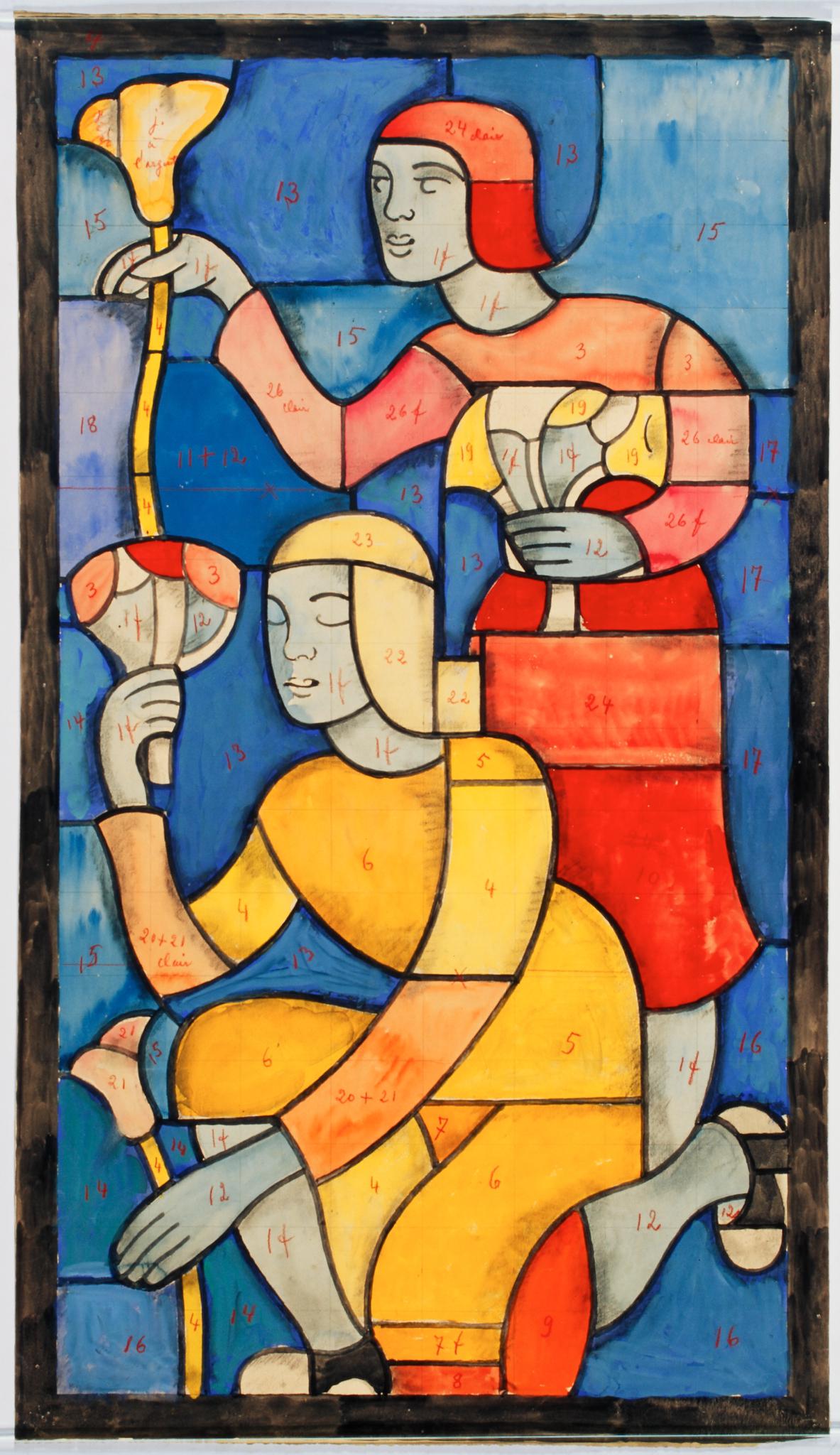 Ce carton en couleur est le modèle précis à l’échelle 1:1 du panneau supérieur droit de la fenêtre centrale pour l’école primaire de la Vignettaz à Fribourg. Ce cycle de douze vitraux se compose de trois fenêtres, constituées chacune de quatre panneaux. Il se situe sur la façade nord-ouest du bâtiment, dans la cage d’escalier au deuxième étage.