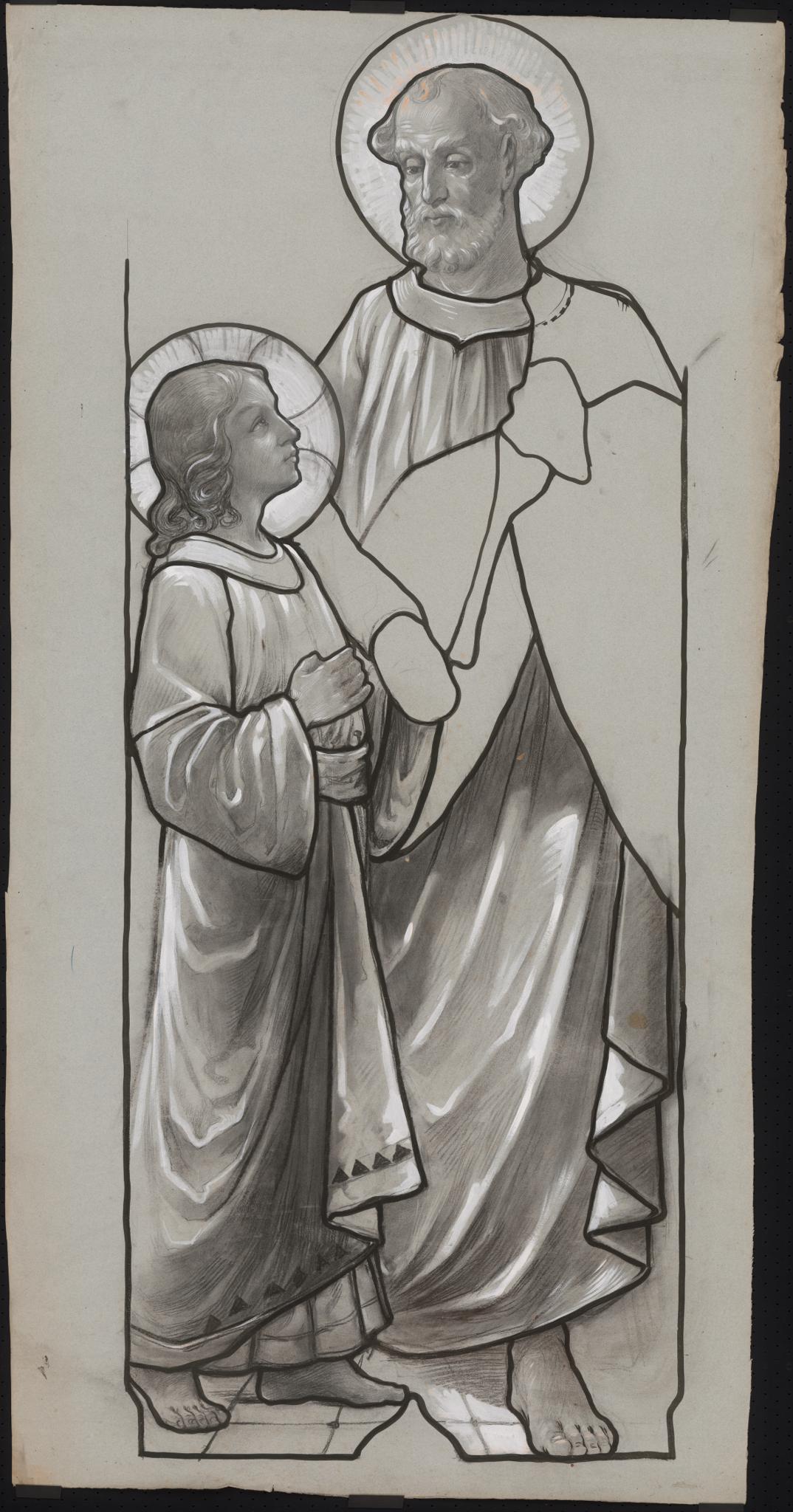 Ce carton en noir et blanc est le modèle à l’échelle 1:1 du deuxième vitrail de droite du choeur de l’église Notre-Dame-de-la-Nativité de Vuisternens-devant-Romont, important édifice néo-classique du canton de Fribourg (Lauper, 2012, p. 204). Le cycle des quatorze vitraux de cette église a été réalisé par l’atelier Kirsch & Fleckner en 1906. Ce vitrail est un don des Frères Dumas (Golet) de Sommentier, comme l’indique l’inscription s’y trouvant.