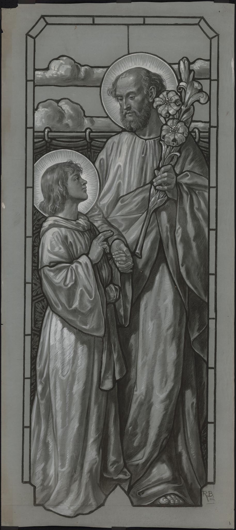 Ce carton peut être mis en lien avec le projet (KF_685) d’un style tout autre, qui semble correspondre à une seconde phase de réalisation. Les visages de Joseph et Jésus sont différents, de même que certains détails des vêtements. Le signe de bénédiction de Jésus a été supprimé sur ce carton KF_685 et sur le vitrail. La comparaison de ce carton avec les travaux contemporains de Fortuné Bovard pour Cugy (1906-1907), où l’artiste collabore avec l’atelier Kirsch & Fleckner, permet d’affirmer que ce travail est de sa main. C’est l’atelier qui aurait contacté Fortuné Bovard pour la réalisation des vitraux de Cugy, vers la fin de l’année 1906 d’après les devis établis (Pasquier, 1999, p. 46). Selon Augustin Pasquier (1999, p. 55), cette demande impliquerait des liens entre l’artiste et l’atelier antérieurs à la commande de Cugy, peut-être par le biais d’un apprentissage ou de collaborations antérieures.