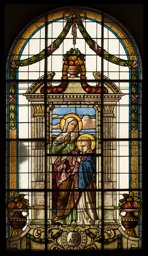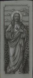On retrouve sur ce carton l’essentiel des indications pour l’ornementation des quatre vitraux du choeur : le cadre architectural entourant les figures, le fond à verre blanc simple en rectangles, les bordures avec la guirlande, etc.