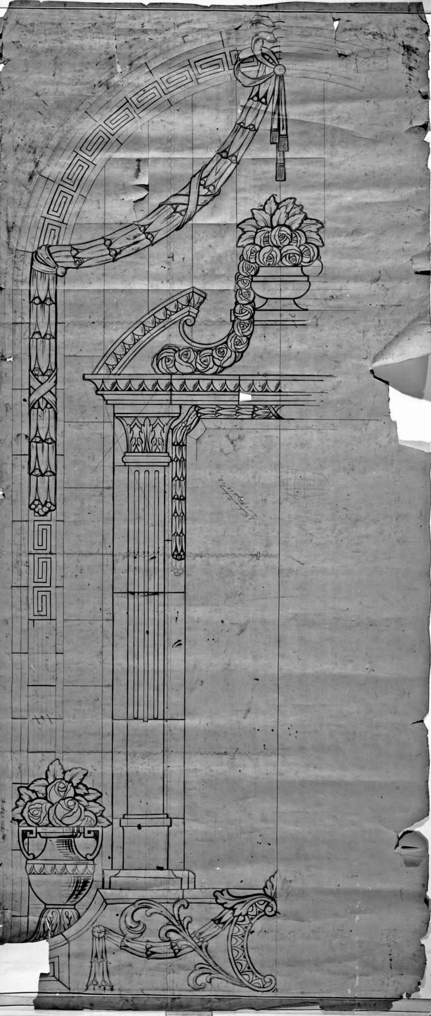 Encadrement architectural dont seule la partie gauche est représentée, avec pilastre engagé surmonté d’un chapiteau corinthien, soutenant un entablement à fronton cintré brisé au centre duquel est posé un vase supportant une guirlande de rose. Un grand vase garni de roses est disposé en bas à gauche. L’arrière plan est composé d’un quadrillage rectangulaire et le tout est encadré d’une bordure ornementale de grecques avec dans la partie supérieure une grande guirlande attachée au sommet par un ruban.