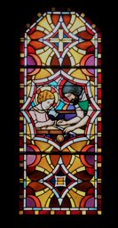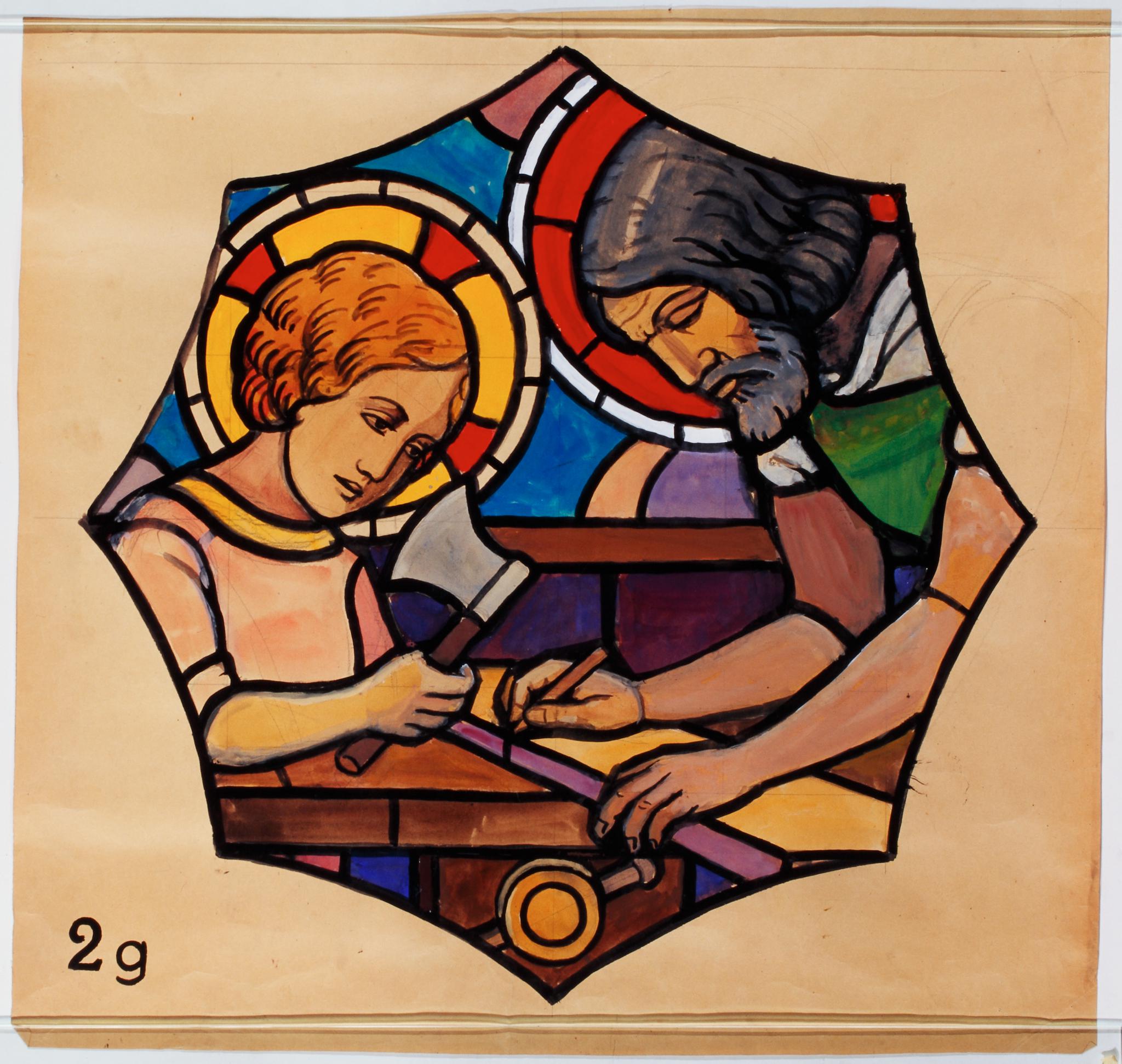 Ce carton en couleur est le modèle précis à l’échelle 1:1 de la partie figurée (octogone aux bords incurvés) du vitrail consacré Joseph et le Christ dans l’atelier de menuiserie pour la quatrième fenêtre à gauche de la chapelle du Sacré-Coeur de l’EMS les Fauvettes à Montagny-la-Ville. Toute la partie ornementale manque et fait l’objet d’un carton séparé, le KF_1058.