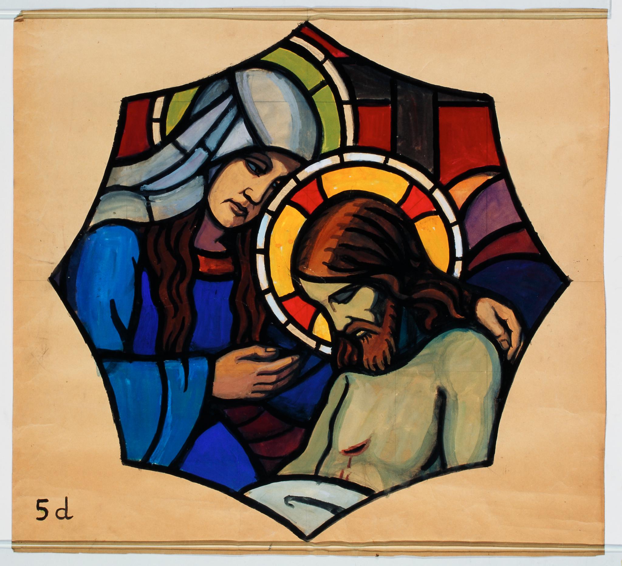 Ce carton en couleur est le modèle précis à l’échelle 1:1 de la partie figurée (octogone aux bords incurvés) du vitrail consacré à la Pietà pour la première fenêtre à droite de la chapelle du Sacré-Coeur de l’EMS les fauvettes à Montagny-la-Ville. Toute la partie ornementale manque et fait l’objet d’un carton séparé, le KF_1058.