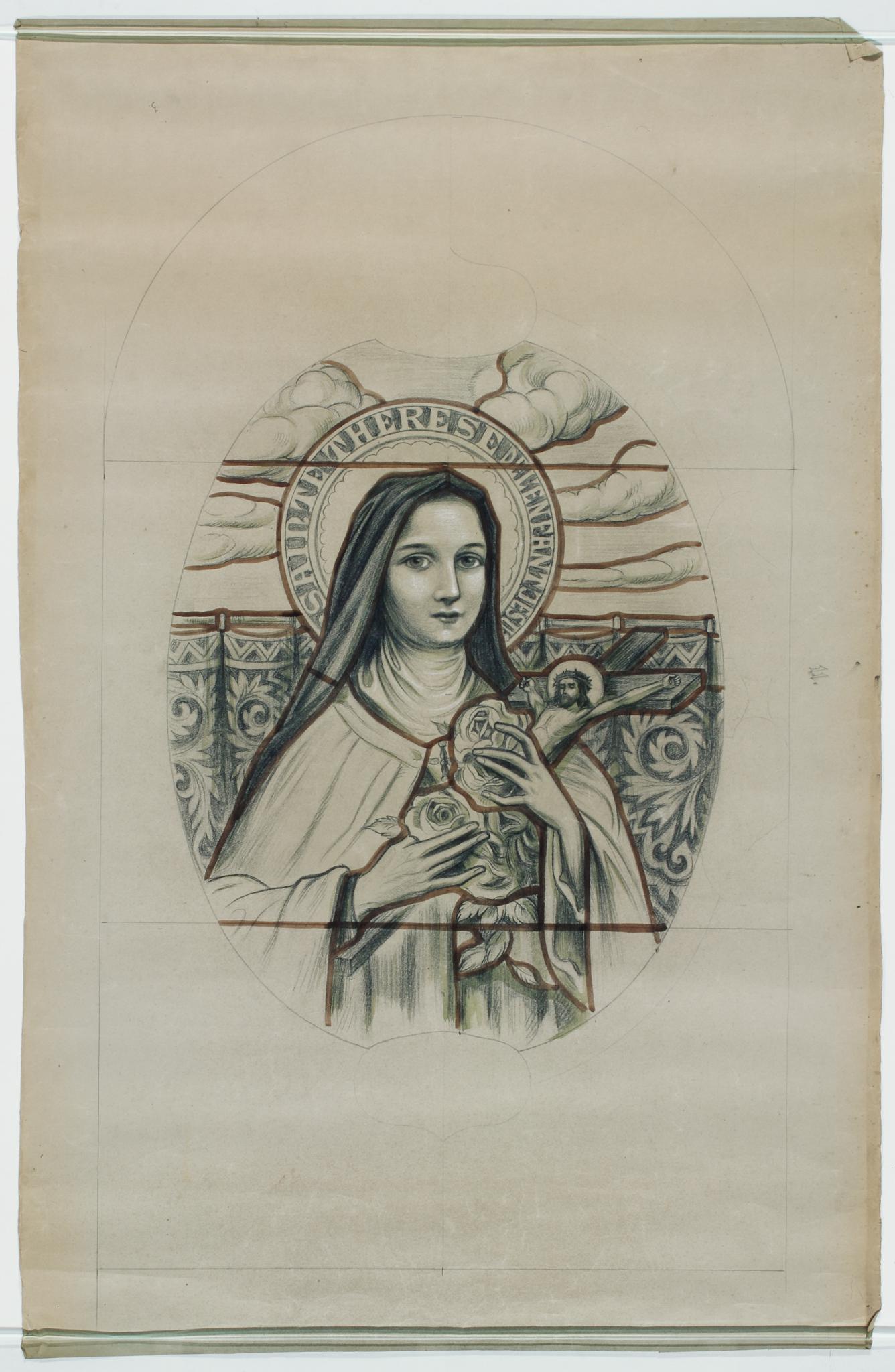 Dans un médaillon, Thérèse de Lisieux en buste se présente de trois-quarts. Elle tient entre ses deux mains un crucifix recouvert dans sa partie inférieure de roses. Derrière elle une tenture soutenue par une tringle se déploie à mi-hauteur et des nuages se développent au-dessus.