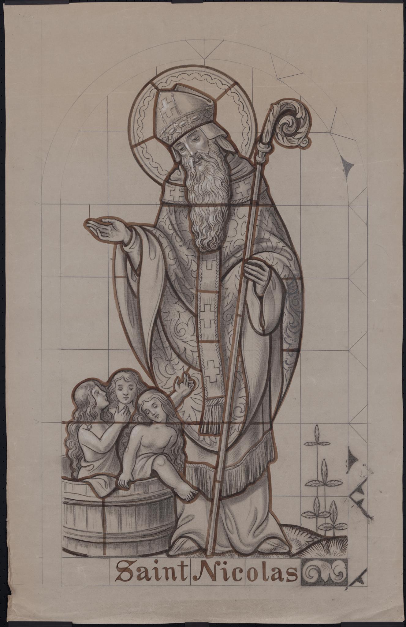 Ce carton en noir et blanc est un projet pour le vitrail de saint Nicolas, situé dans la première fenêtre à droite dans la nef de la chapelle Notre-Dame-de-la-Brillaz à Prez-vers-Noréaz. Ce petit sanctuaire, lieu de pèlerinage local, est édifié en 1926-1927 par l’architecte fribourgeois Léon Hertling (Lauper, 2012, p. 240). Douze petits vitraux ornent l’ensemble des fenêtres. C’est l’artiste-architecte Jean Crivelli (les trois maquettes KF_122, KF_162 et KF_163 sont signées de ses initiales JC) et l’atelier fribourgeois Kirsch & Fleckner qui en sont les auteurs. Le cycle date de la construction du bâtiment en 1927 (le vitrail de sainte Cécile est signé et daté en bas à droite : KIRSCH et FLECKNER / FRIBOURG . 1927.).