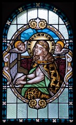 Ce carton ne présente presque aucune différence avec la maquette KF_122 qui le précède dans le processus créatif du vitrail, si ce n’est le visage des deux anges qui sont plus enfantins que poupons et les ornements décorant la tenture derrière la sainte.