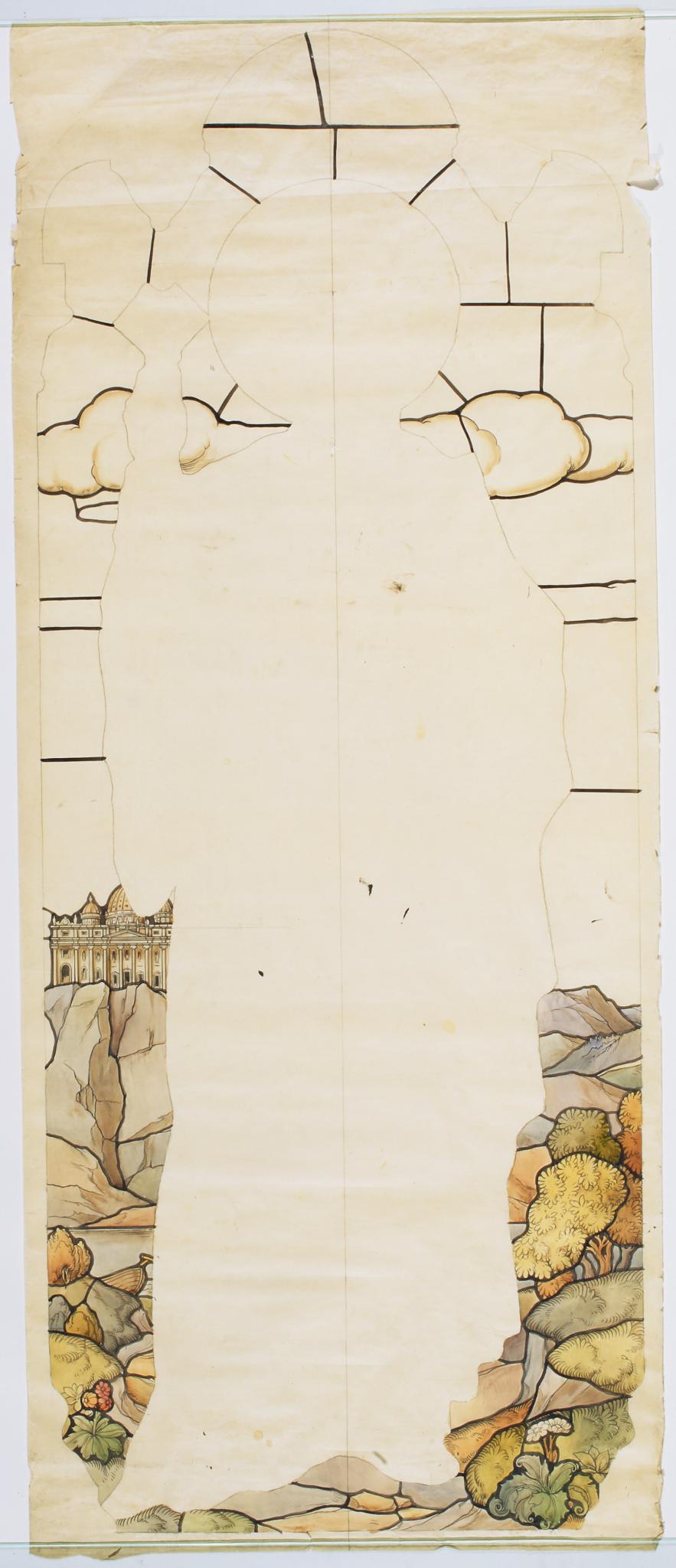 Ce carton en couleur est le modèle précis à l’échelle 1:1 de l’arrière-plan du vitrail consacré à saint Pierre situé à gauche de la fenêtre axiale de l’église Saint-André à Onnens. Toute la partie ornementale manque.