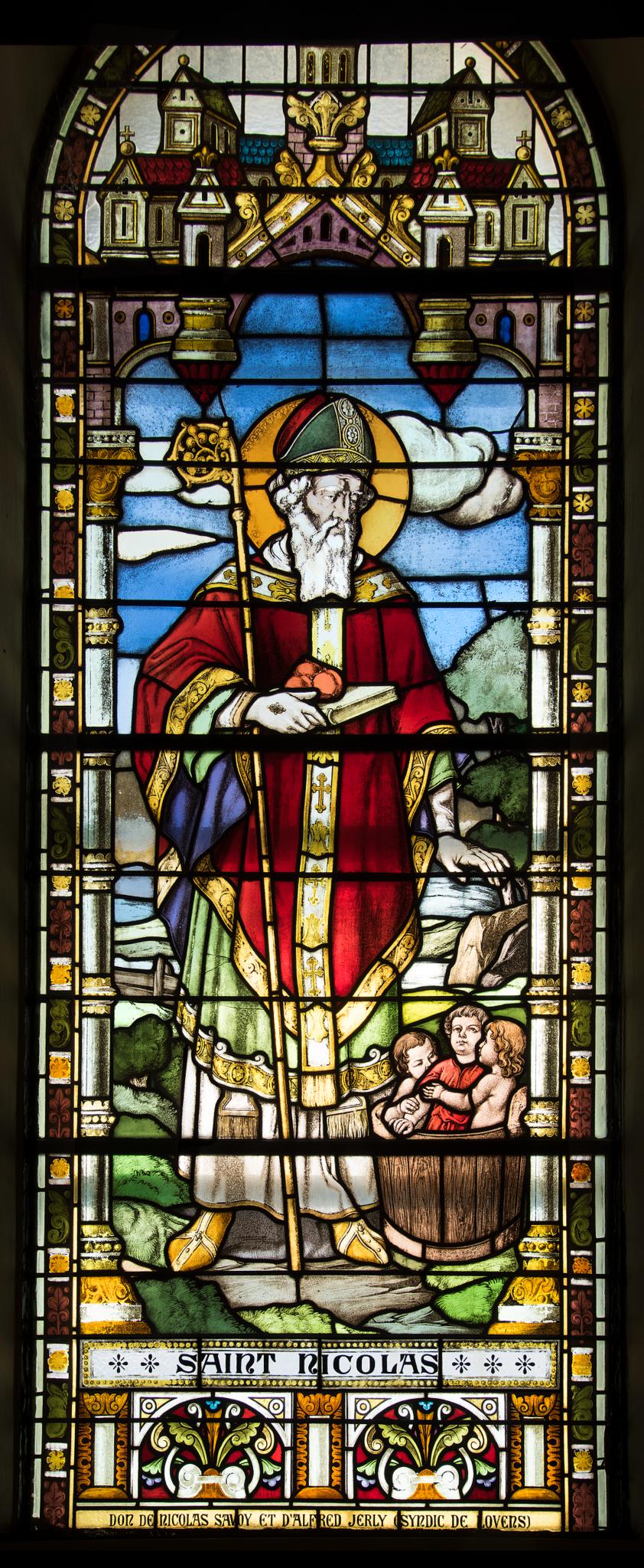 Ce vitrail consacré à Nicolas de Myre se situe dans la deuxième fenêtre à gauche dans la nef de l’église Saint-André à Onnens.