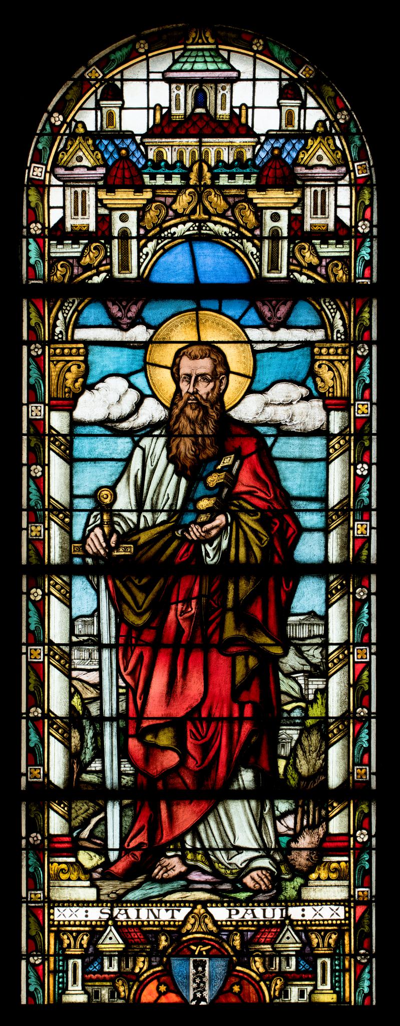 Saint Paul debout de face tient une épée, la pointe posée sur le sol, de sa main droite et de la gauche un livre fermé. A l’arrière-plan, sur la partie inférieure, quelques ruines de l’Acropole d’Athènes apparaissent, dont le Parthénon. En dessous, des arbres s’érigent devant des murs. Ce paysage représente un événement important de la vie du saint: sa discussion avec les philosophes à l’Aéropage d’Athènes.