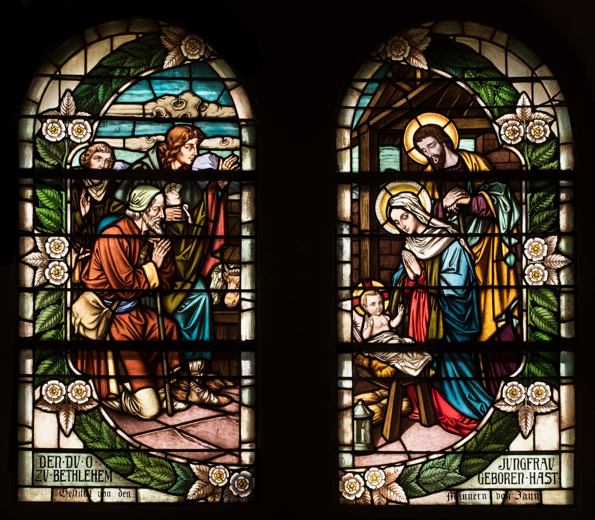 Au centre du vitrail à deux lancettes se trouve l’Adoration des bergers dans un médaillon : à gauche, trois bergers viennent rendre hommage à l’enfant Jésus. Au premier plan, un homme arborant une barbe blanche est agenouillé, les mains jointes. Il porte une besace en bandoulière et une canne. Le second est debout et tient un agneau dans son bras droit. Derrière, le troisième, plus jeune, est debout et lève sa main droite en signe de salutation. Devant eux à l’arrière-plan, les têtes de l’âne et du boeuf. A droite, l’enfant Jésus est assis dans une mangeoire, les bras ouverts devant lui. A ses côtés à droite, la Vierge est agenouillée les mains jointes, le visage représenté de trois quarts. Debout derrière elle, Joseph, les deux mains appuyées sur une canne, regarde l’enfant. Au premier plan, une lanterne avec une bougie allumée est posée au pied de la mangeoire et sous celle-ci il y a deux fagots de paille. Au second plan, une étable faite de briques et d’une charpente de bois, laisse apparaître par une ouverture un paysage de montagnes avec un ciel traversé par deux nuages.
