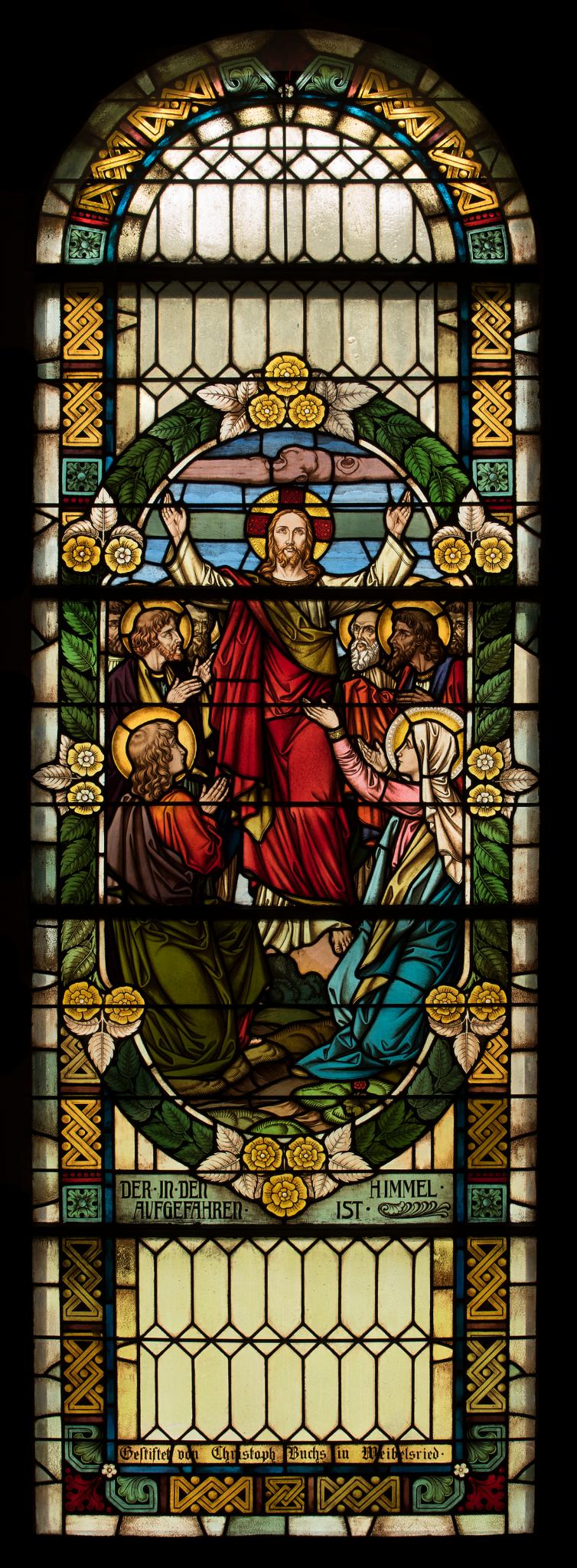 Au centre du vitrail se trouve une scène narrative dans un médaillon oblong : au centre, le Christ, debout et les bras ouverts, monte au ciel. Il est entouré des douze apôtres et de la Vierge. Seuls certains visages sont visibles, les autres étant indiqués uniquement par leurs nimbes. Saint Jean, au premier plan à gauche est agenouillé et de profil devant le Christ, tout comme la Vierge à droite, ouvrant ses bras vers le Christ. Une bande horizontale de nuages se déploie au-dessus du Christ.