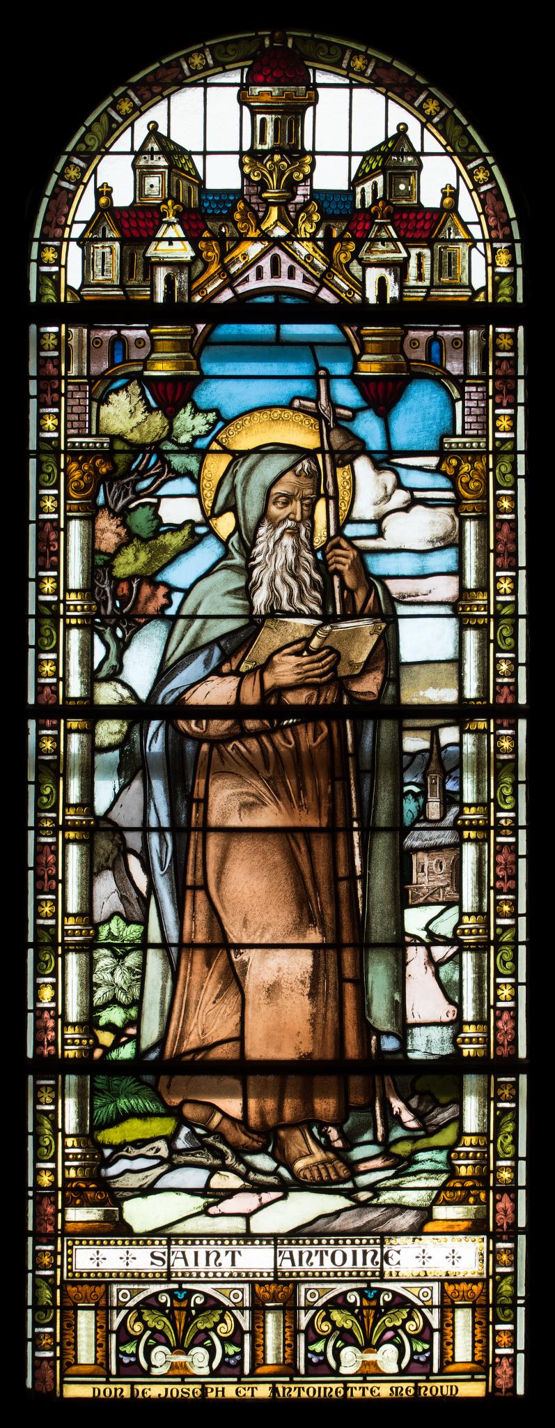 Ce vitrail consacré à saint Antoine se situe dans la cinquième fenêtre à gauche dans la nef de l’église Saint-André à Onnens.