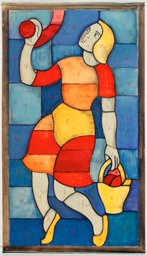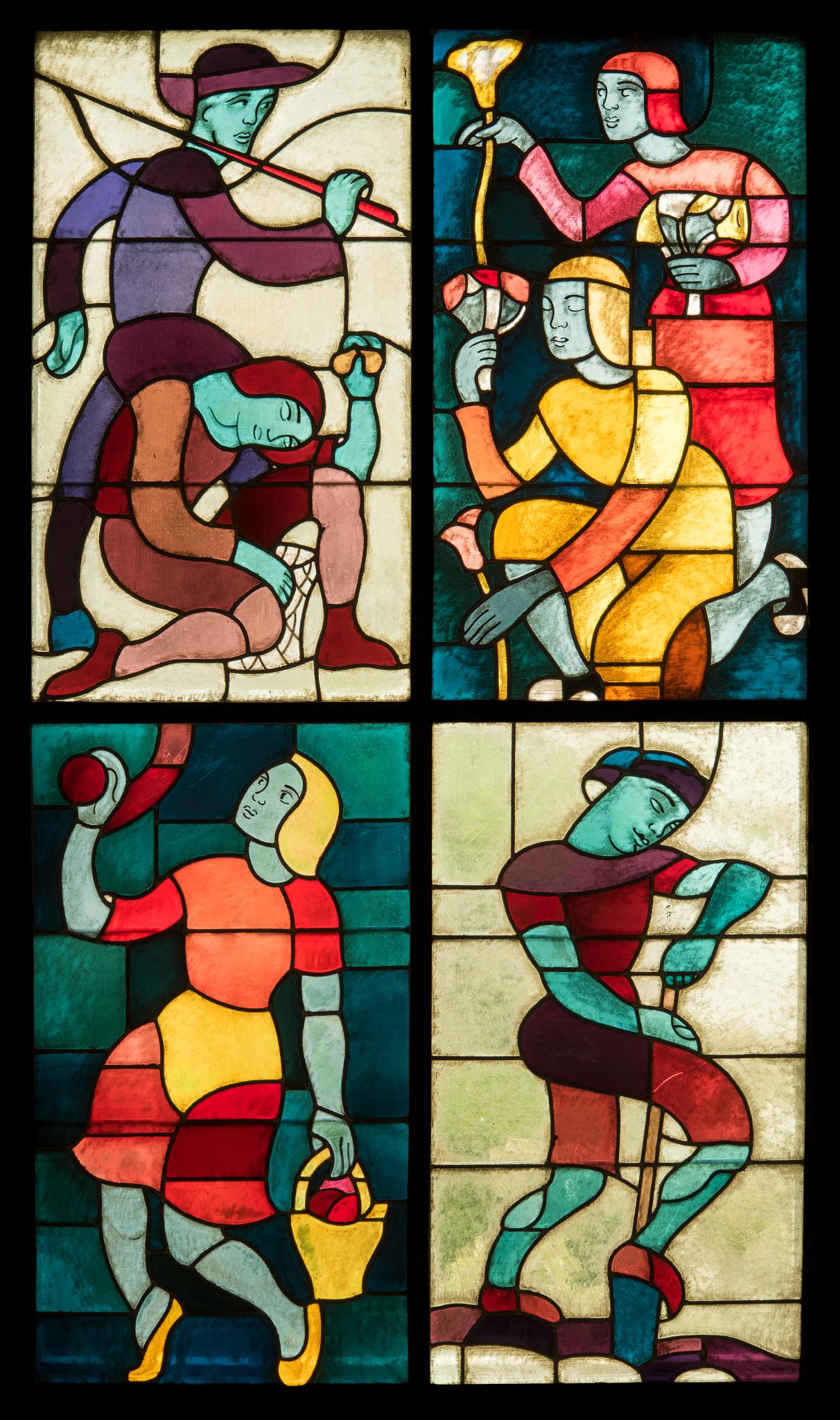 Ce cycle de douze vitraux pour l’école primaire de la Vignettaz se compose de trois fenêtres, constituées chacune de quatre panneaux. Il se situe sur la façade nord-ouest du bâtiment, dans la cage d’escalier au deuxième étage. Cette fenêtre avec deux pêcheurs, deux cueilleuses de fleurs, une cueilleuse de fruits et un jardinier est la seconde baie au centre.