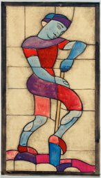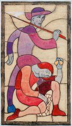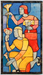 Réalisé par l’artiste Jean-Edouard de Castella et l’atelier fribourgeois Kirsch & Co, lors de la construction de l’école en 1949 (le vitrail du carton KF_381 est signé et daté en bas : „KIRSCH & Co J.E. de Castella 1949), cet ensemble de douze vitraux, d’apparence très simple, s’avère très subtil. La construction globale de cette grande paroi de verre joue sur les alternances : celle des sexes (homme-femme), du nombre de personnages (un ou deux), des fonds colorés (bleu-blanc) et des tons (chauds-froids). Elaborée sur la diagonale et l’horizontale, cette succession permet une lecture très aisée dégageant une sensation globale plaisante et ludique.