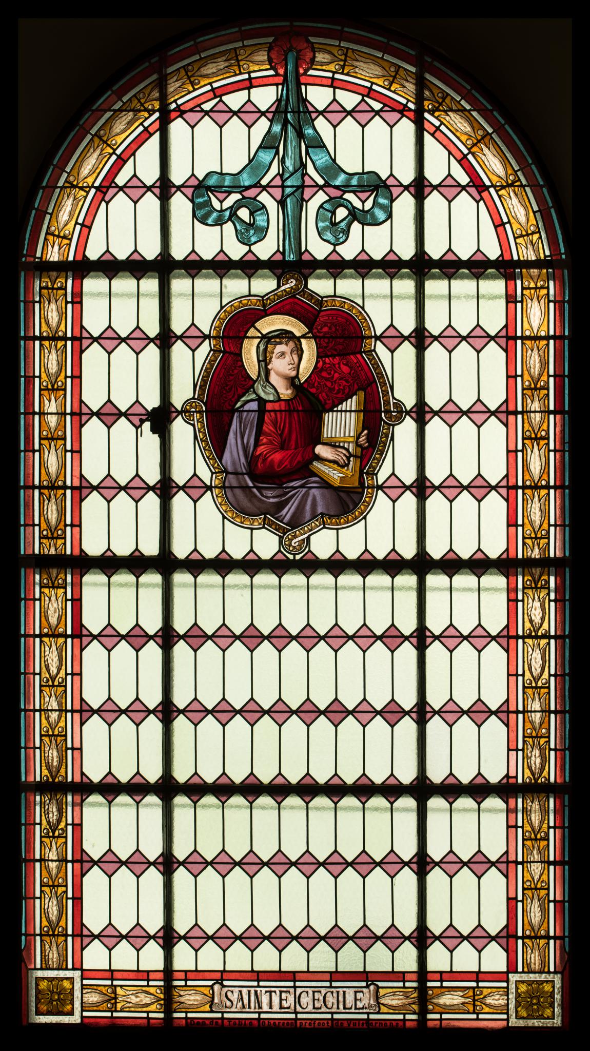 C’est l’artiste Raymond Buchs qui est l’auteur des quatre vitraux du choeur, comme le prouvent les cartons de sa main se trouvant dans le fonds graphique de l’atelier Kirsch & Fleckner. En 1906, l’artiste se trouve à Berlin, tout en continuant à collaborer avec l’atelier Kirsch & Fleckner (Rudaz, 2001, p. 19-20). Il termine à ce moment là un autre grand cycle de vitraux fribourgeois pour l’église de Neyruz (1904-1906). Les dix vitraux de la nef, ornementaux avec des médaillons figurants des saints réalisés d’après des modèles réutilisés d’églises en églises par l’atelier, ne peuvent pas être attribués à l’artiste et sont probablement plutôt une oeuvre d’atelier. Les cartons correspondants aux médaillons des verrières de la nef ne se trouvent pas dans le Fonds Kirsch & Fleckner. Deux cartons dédiés aux parties ornementales des vitraux de la nef et du choeur ont été retrouvés dans le fonds. Le carton KF_735 pour le choeur, qui pourrait être de la main de Raymond Buchs, et le carton KF_734 pour la nef, probablement une oeuvre d’atelier.