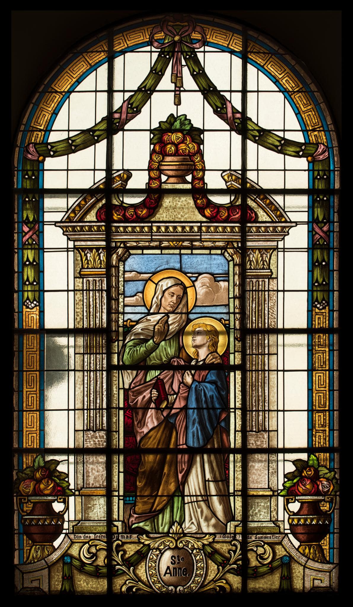 Sainte Anne voilée et auréolée debout à gauche, bénit de la main la Vierge adolescente debout à ses côtés, qu’elle tient par l’épaule. Le Vierge auréolée lève la tête vers sa mère, un bras replié contre elle et l’autre tenant un livre fermé. En arrière-plan, un rideau fixé à une tringle couvre les trois-quarts de la composition, avec un ciel nuageux dans la partie haute. Cette scène est intégrée dans un encadrement architectural composé de pilastres corinthiens soutenant un entablement surmonté d’un fronton cintré brisé au centre duquel est posé un vase supportant des guirlandes de rose. Deux grands vases garnis de roses sont disposés de part et d’autre du soubassement. Le fond de la verrière est constitué de verre blanc. Le tout est encadré d’une bordure ornementale composée de grecques avec dans la partie supérieure deux grandes guirlandes symétriques rassemblées au sommet par un ruban.