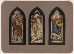 Cette maquette correspond à un premier projet probablement réalisé en 1906 d’après les devis établis par Kirsch & Fleckner conservés aux archives de la paroisse de Cugy, pour les quatre groupes de trois verrières du choeur. Celles-ci auraient dû comprendre une figure d’évangéliste dans la baie centrale, accompagnée de deux verrières ornementales avec un phylactère vide sur fond végétal, probablement destiné à accueillir une parole de l’évangile, dont le projet type est présenté sur cette maquette. Dans les notes manuscrites d’Edouard Gambon, on peut lire que ce dernier demande à Fortuné Bovard de représenter les caractéristiques et le but de chaque évangile, ce que l’artiste a probablement voulu traduire dans cette maquette. Finalement, c’est le thème des quatre vertus (KF_705, KF_706, KF_971, KF_986) qui sera retenu pour les fenêtres hautes du choeur (Pasquier, 1999, p. 34-35, 47).