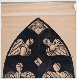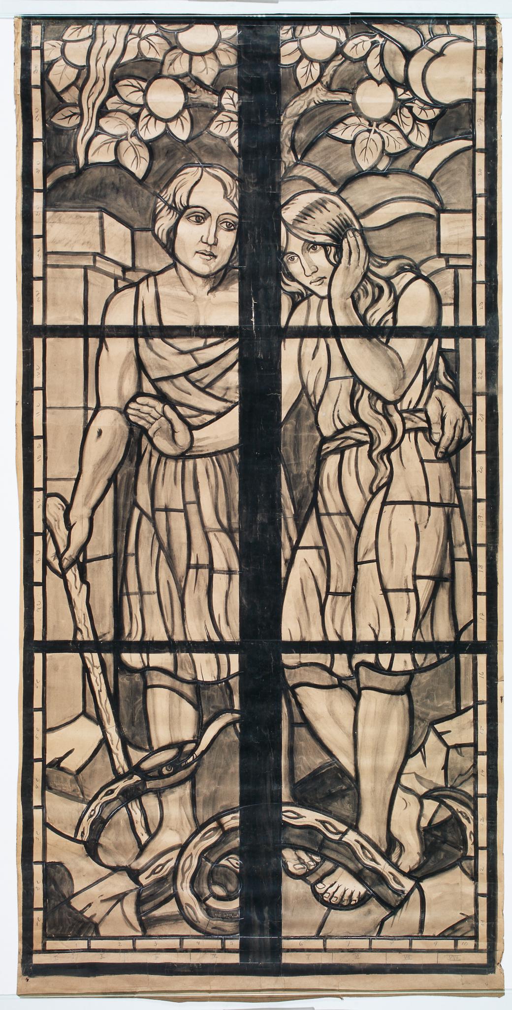 Ce carton en noir et blanc est le modèle précis à l’échelle 1:1 de la partie centrale du vitrail consacré à Adam et Eve chassés du Paradis pour la première fenêtre à droite dans le choeur de l’église Saint-Aubin à Saint-Aubin. La partie supérieure fait l’objet d’un carton séparé, le KF_452.