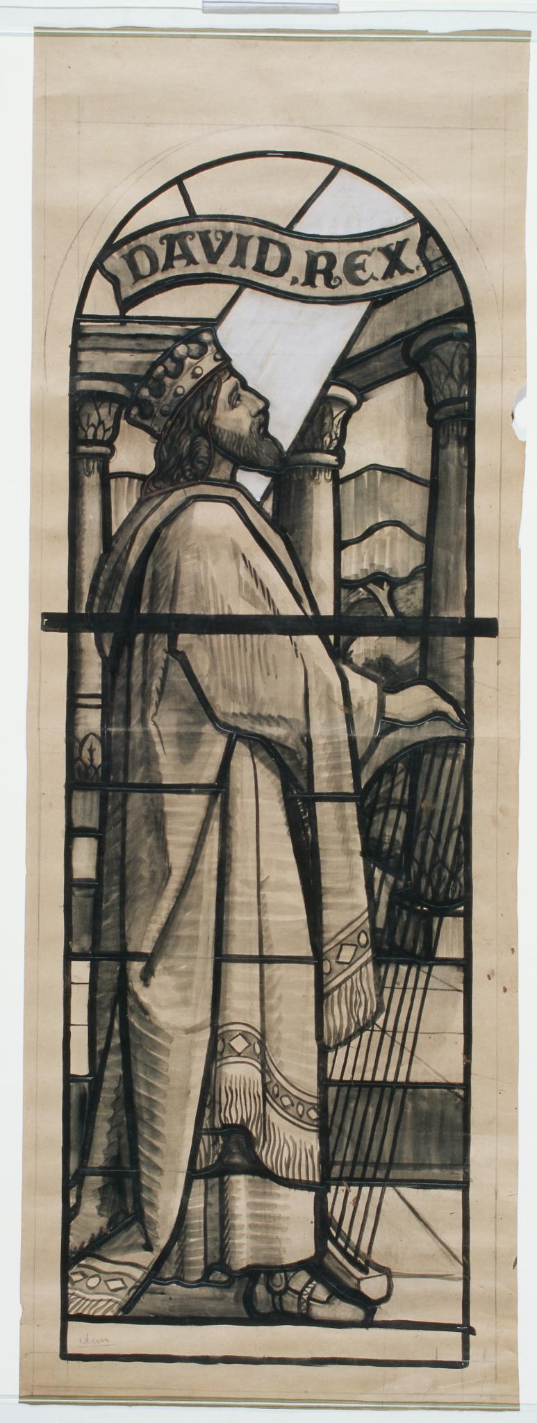 Ce carton est le modèle noir et blanc précis à l’échelle 1:1 du vitrail consacré au roi David situé à droite de la façade occidentale de l’église Saints-Pierre-et-Paul à Villars-sur-Glâne. Seules la bordure et l’inscription sous David manquent.